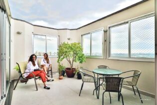 Uma varanda deliciosamente integrada e fechada por folhas de vidro, é aquele lugar pra aproveitar o apê, relaxando, recebendo amigos, e contemplando o belo visual de fora.