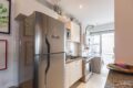 Ao entrar, a sala integrada se conecta naturalmente com a cozinha. Além disso, a luz percorre todo o ambiente e guia o olhar até o jardim. Assim, o apartamento se revela aos poucos, como uma boa visita deve ser.