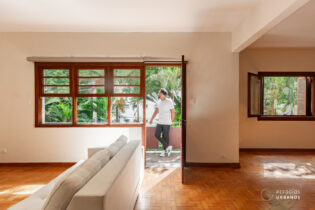 Além do quintal, os ambientes integrados favorecem a circulação e o aproveitamento dos espaços. Ao mesmo tempo amplia a sensação de conforto e luminosidade. Essas características, por sua vez, refletem a arquitetura marcante dos anos 30, que o prédio preserva com elegância e autenticidade.