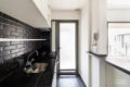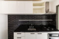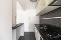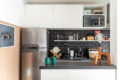 A cozinha é integrada à sala por um balcão, o que estimula a interação entre as pessoas nos dois ambientes. Possui bom espaço de bancada, com cooktop, forno e coifa, que ficam na venda. A marcenaria bem planejada aproveita cada canto e garante muita organização. O revestimento de parede traz personalidade ao espaço.