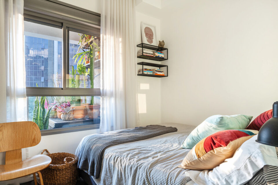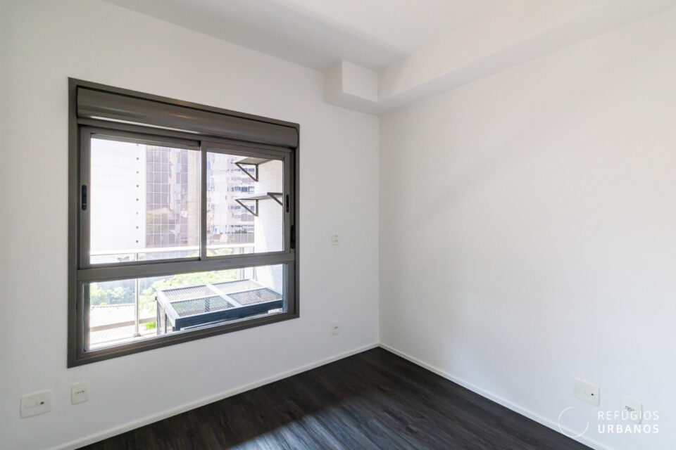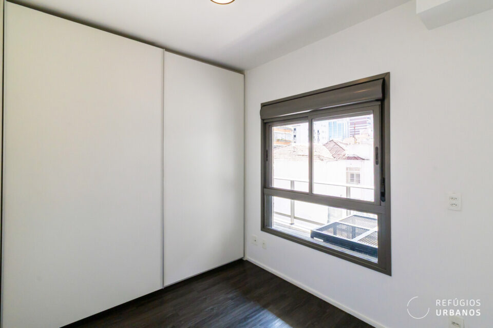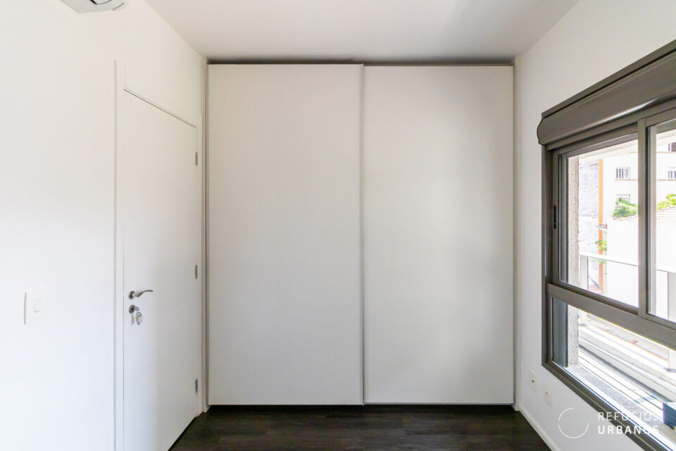 Chegando ao dormitório, temos uma parede inteira com armário do piso ao teto e portas de correr, otimizando o espaço. A janela blackout é ampla, com vista para a varanda: um lugar perfeito para suas plantas!