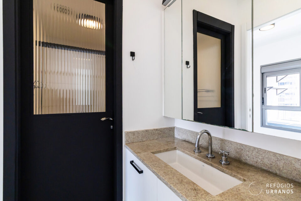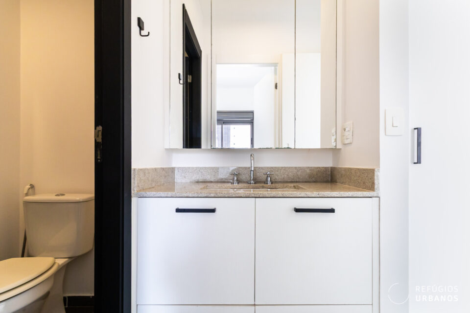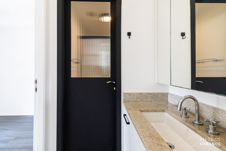 O banheiro funciona tanto como lavabo quanto como “suíte”, dependendo das aberturas das portas. O projeto prioriza a privacidade ao receber convidados.