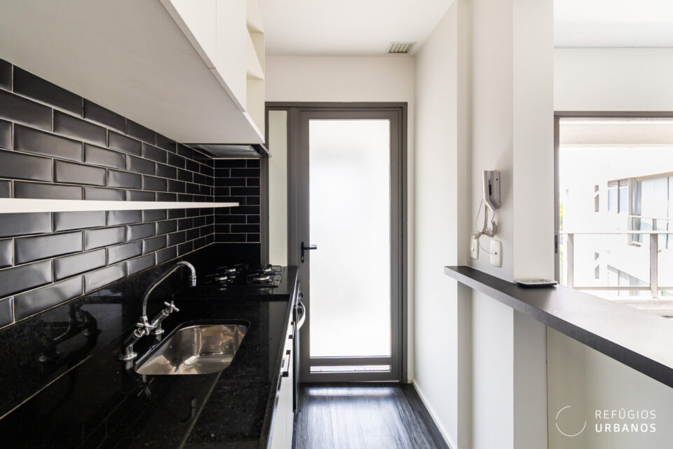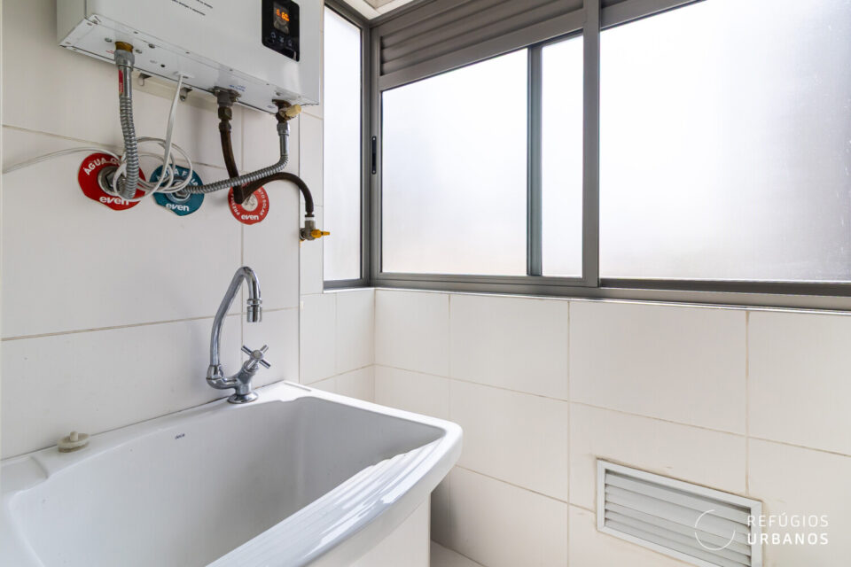 A lavanderia é bem ventilada e muito iluminada. Um detalhe interessante é a película instalada na porta de vidro, que divide o espaço com a cozinha e garante privacidade de objetos e roupas, mas mantém a iluminação natural.
