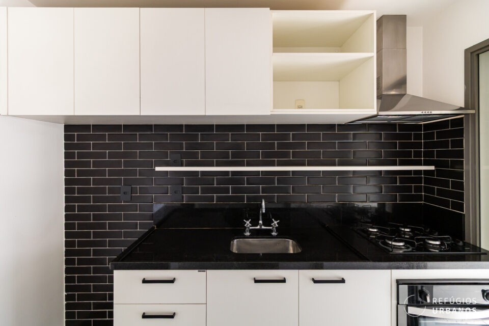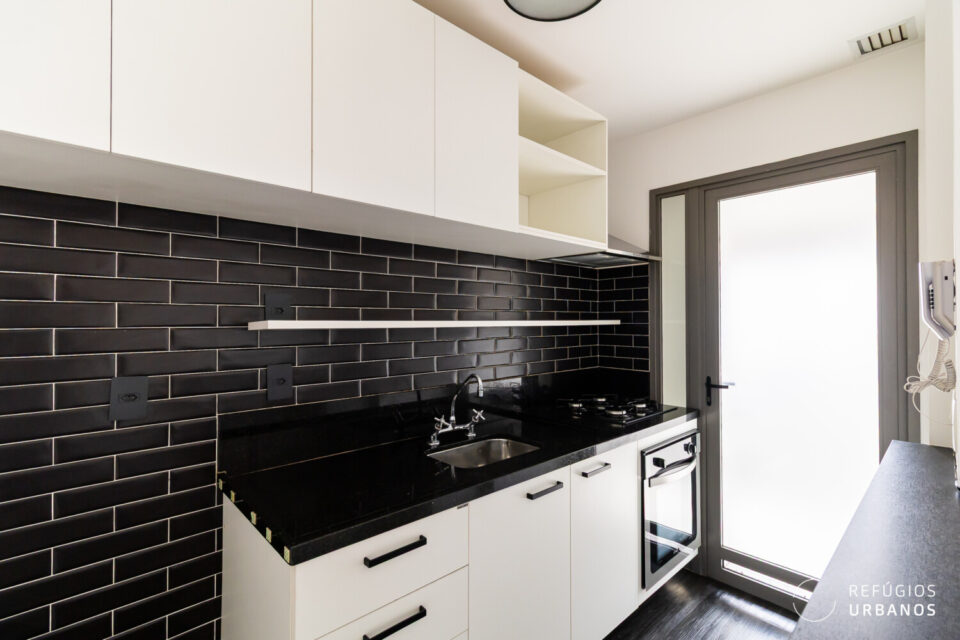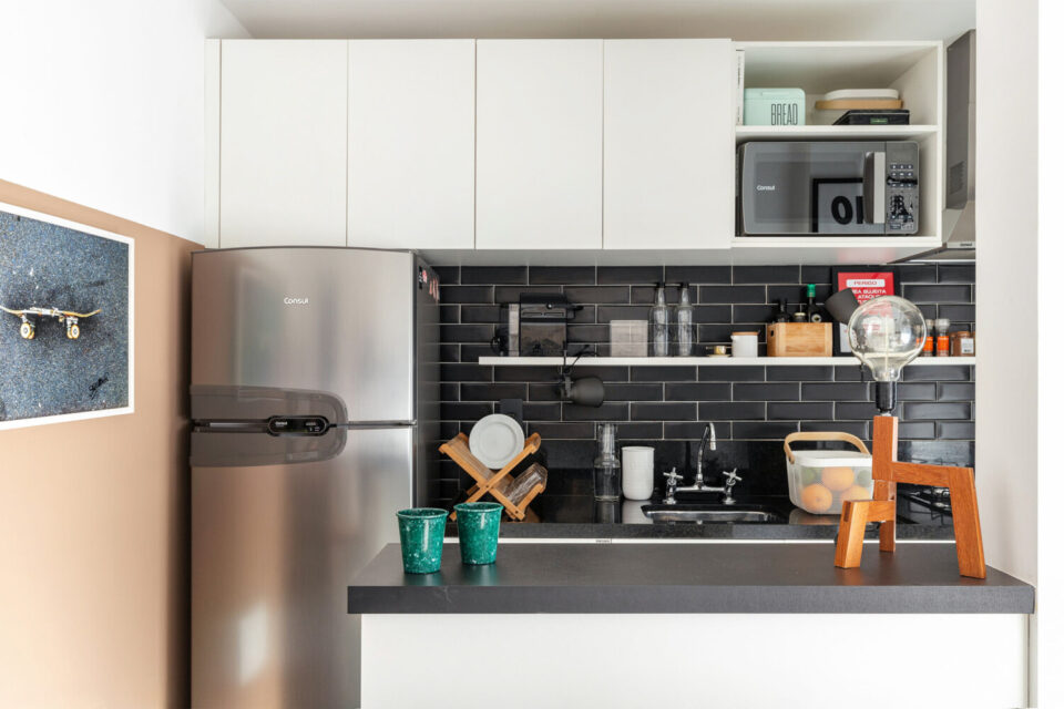 A cozinha é integrada à sala por um balcão, o que estimula a interação entre as pessoas nos dois ambientes. Possui bom espaço de bancada, com cooktop, forno e coifa, que ficam na venda. A marcenaria bem planejada aproveita cada canto e garante muita organização. O revestimento de parede traz personalidade ao espaço.