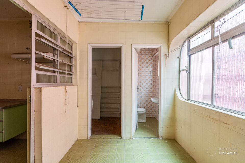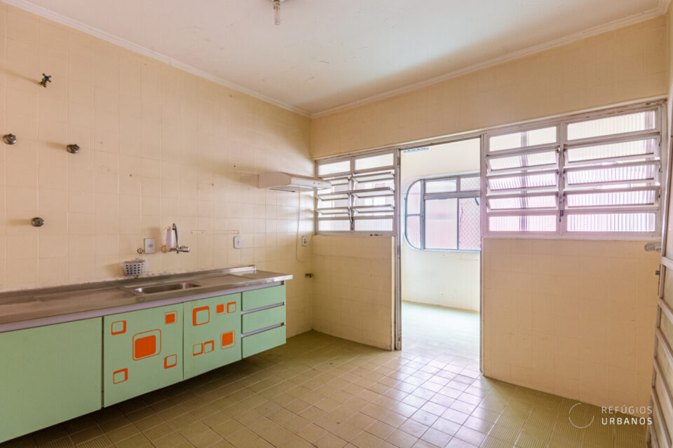 Aqui, temos uma planta com ambientes de bom tamanho, a começar pela sala com área de estar e jantar. Além disso, há possibilidade de integração com a cozinha em uma reforma. Aliás, a cozinha é espaçosa e tem entrada independente pelo hall. Por ela, acessamos uma arejada área de serviço, um quarto pequeno e um banheiro de apoio. Desta forma, é possível fazer mais uma despensa e um lavabo.
