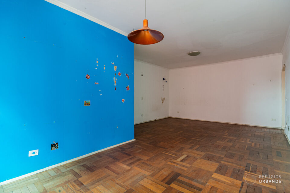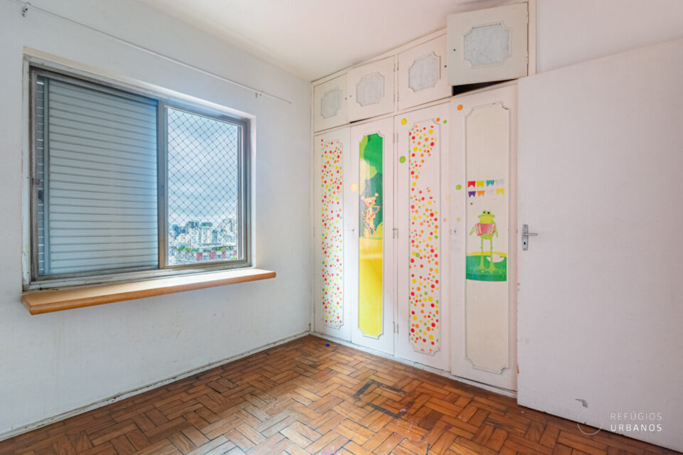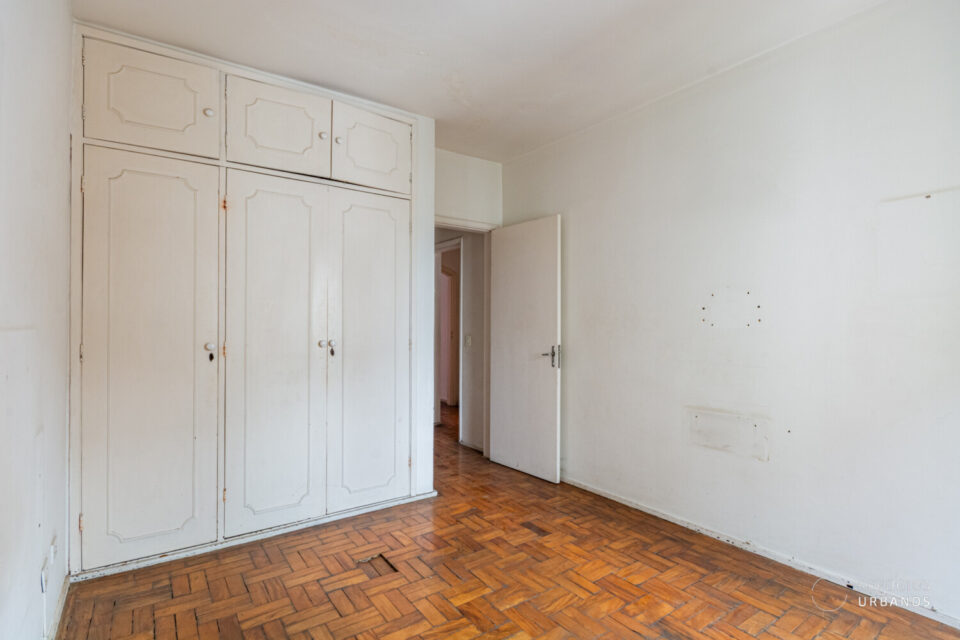 Em todo o apartamento há piso de madeira esperando uma restauração e, desta forma, tem potencial para criar um clima aconchegante. Pelo corredor da área íntima, acessamos dois dormitórios que já contam com armários em madeira maciça.