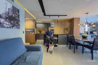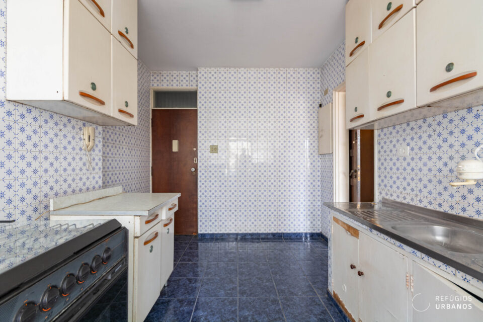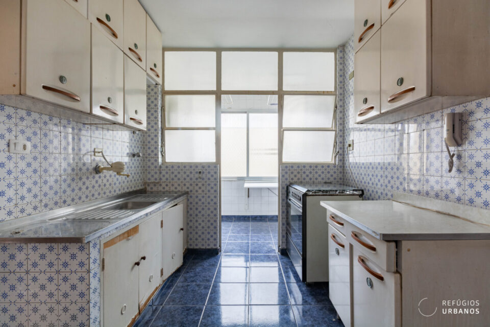 E, por fim, a cozinha, que pode ser aberta para o living e com uma área de serviço generosa. Do mesmo modo, conta com o janelão que percorre todos os ambientes desse apartamento. E, além de tudo isso, conta com um amplo quarto de serviços, e banheiro.