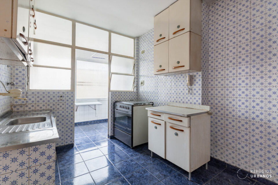 A cozinha é retangular e iluminada, e além da generosa área de serviço, um bom quarto de apoio e banheiro.