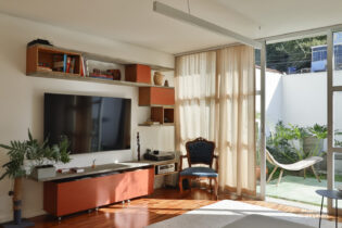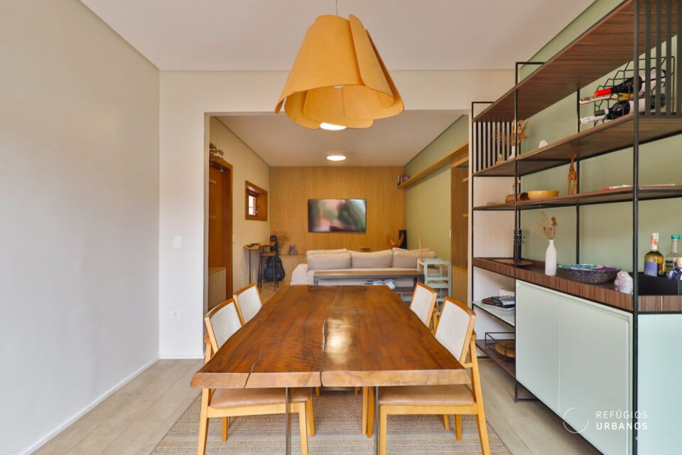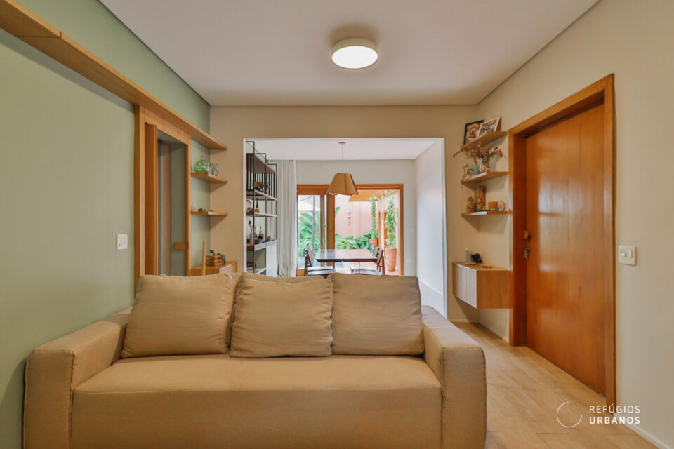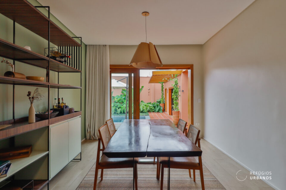 Ao entrar na casa, somos recebidos pelas áreas de estar e jantar, amplas e integradas, típicas de uma construção dos anos 70. O pé-direito alto amplia a sensação de espaço, enquanto a abundante iluminação natural valoriza todo o ambiente. A luz entra generosa pela porta-balcão, que emoldura a vista para o belo jardim e cria uma conexão constante com o verde do quintal. É difícil não se deixar levar pelo olhar em direção à piscina logo adiante — mas já chegamos lá.