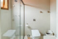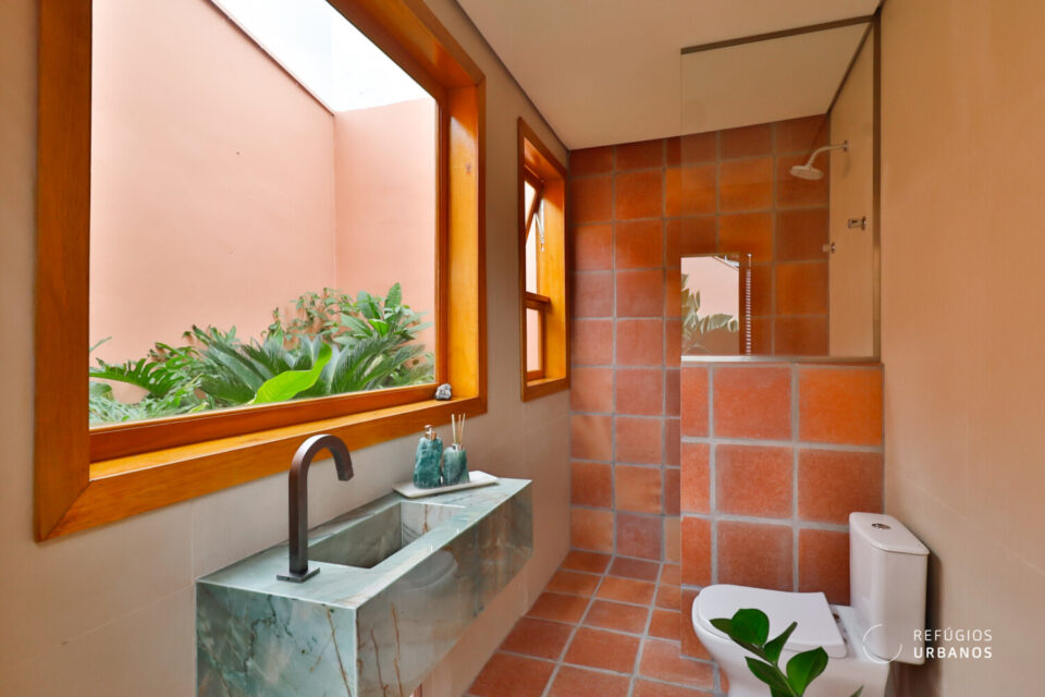 Mais adiante, encontramos o banheiro social, elegante e acolhedor. A escolha dos tons neutros e dos materiais — da marmoraria ao piso, passando pela marcenaria e pintura — cria um conjunto sofisticado e confortável.