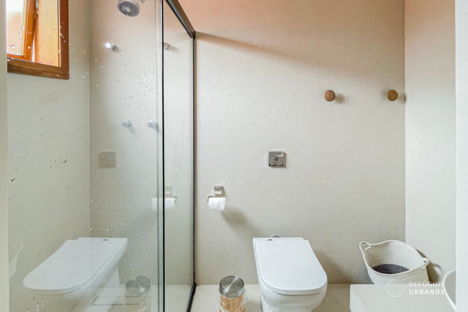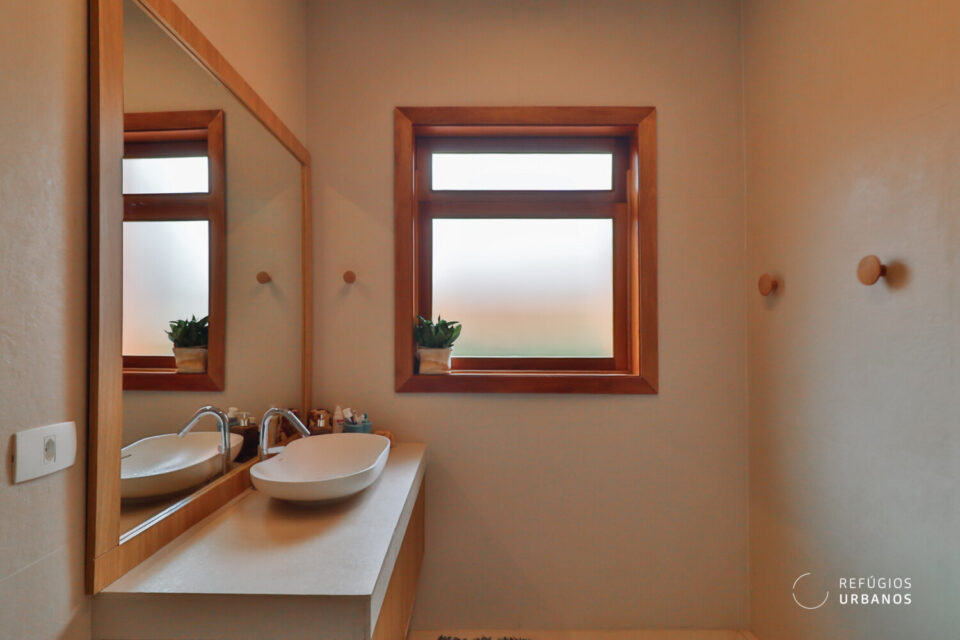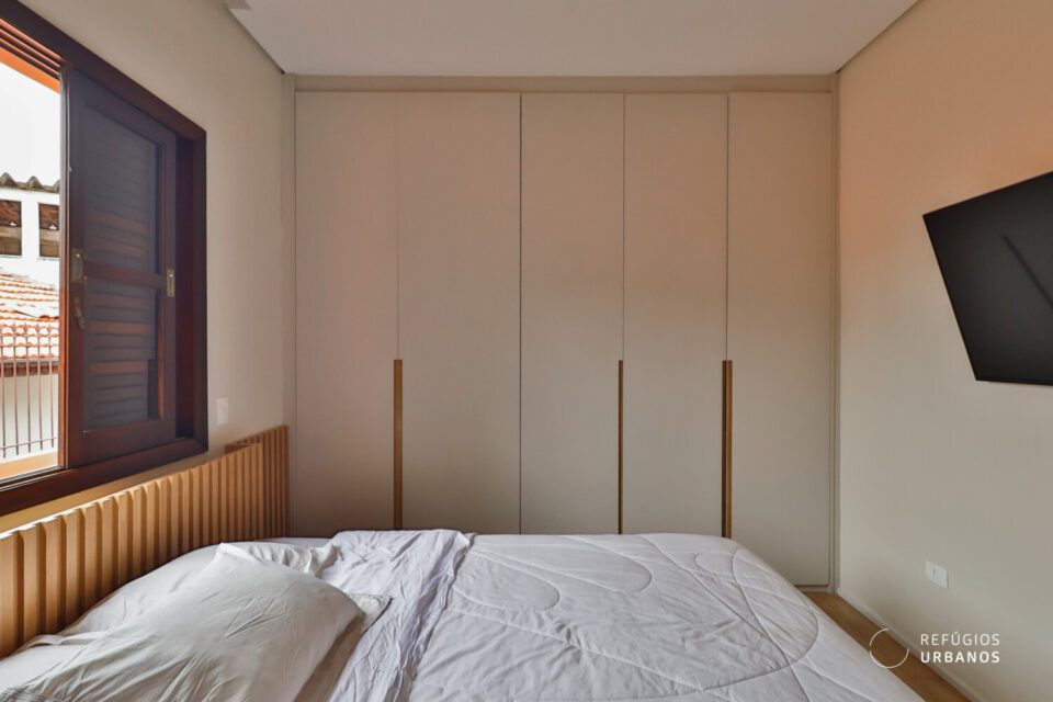 Por fim, chegamos à suíte. O ambiente conta com cabeceira em marcenaria ripada, excelentes armários e muita luz natural. Entre as portas do guarda-roupas, surge uma surpresa cheia de memória afetiva: o banheiro completo da suíte fica discretamente embutido no armário, uma solução charmosa e bastante comum nos anos 80, que adiciona personalidade e história ao espaço.