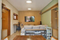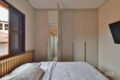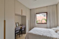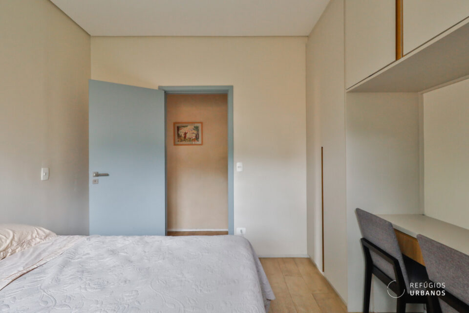 Voltando ao corredor e seguindo à esquerda, acessamos o primeiro quarto. O espaço recebe excelente iluminação natural por meio de um amplo janelão em madeira e dispõe de um grande guarda-roupas em tom creme, que integra de forma inteligente uma mesa pronta para home office.