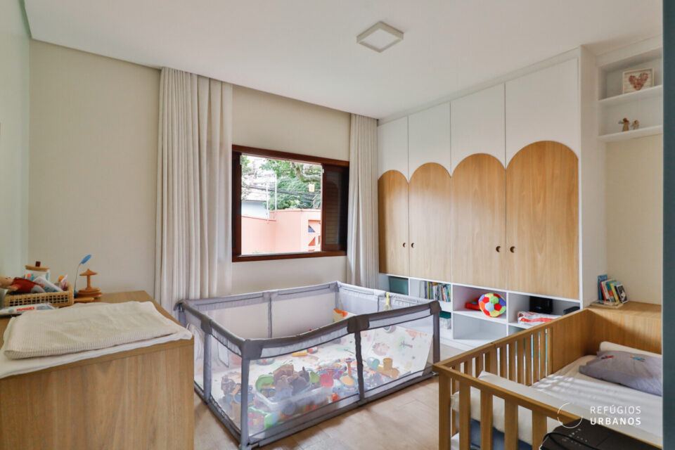 Em frente, o segundo quarto mantém o mesmo padrão de qualidade da casa, com ótima marcenaria e iluminação natural abundante, garantida por seu grande janelão.