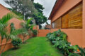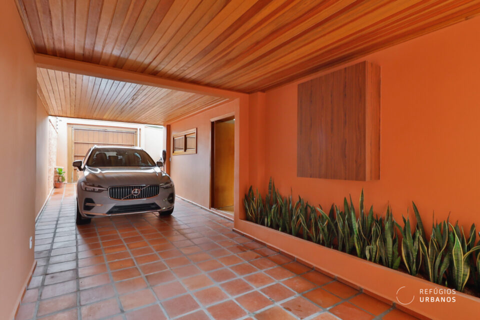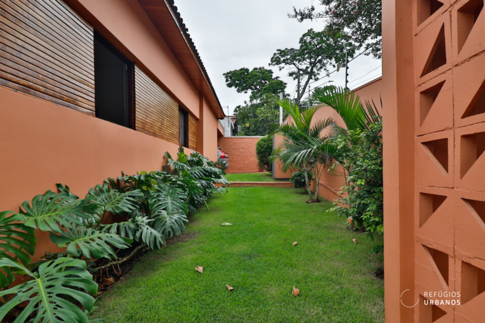 Recuada em relação ao portão, a casa dá espaço a um belo jardim com costelas-de-adão, com um caminho que nos leva até a garagem e à porta de entrada principal da casa nos levando para dento desse belo refúgio.