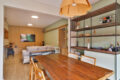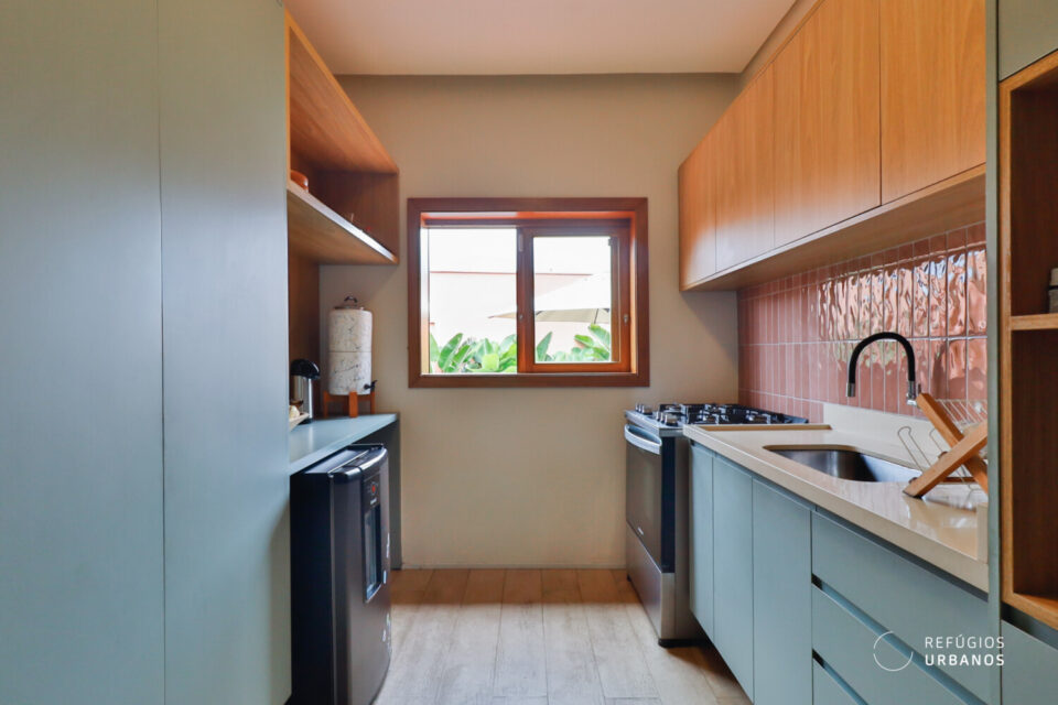 Seguindo pelo ambiente social, caminhamos até o corredor. À direita, encontramos uma charmosa cozinha, que equilibra funcionalidade e estética com muita harmonia. Bem arejada e iluminada por uma janela com esquadria de madeira, ela conta com marcenaria de ótima qualidade, em tons claros e naturais, trazendo aconchego e atemporalidade.