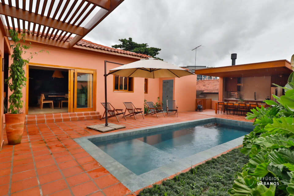 Descendo as escadas a partir da porta-balcão da sala, chegamos à área externa da casa, um espaço pensado para lazer e bem-estar. Recentemente reformado, esse ambiente abriga uma belíssima piscina, pronta para ser aproveitada durante todo o ano. Ela conta com aquecimento, o que permite o uso tanto nos dias quentes quanto nos mais frios, sem restrições. Além disso, a casa dispõe de aquecimento solar de água e painéis fotovoltaicos novos, que garantem maior eficiência energética e reduzem significativamente os custos mensais.