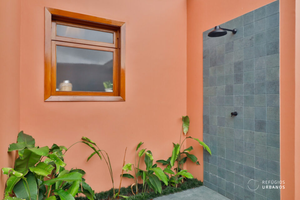 O lazer se completa com um chuveirão e uma cozinha externa impecável, perfeita para receber. A churrasqueira é robusta e bem equipada, com exaustor potente, bancada generosa, espaço para geladeira e uma mesa feita sob encomenda, criando o cenário ideal para encontros animados aos fins de semana.