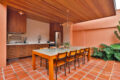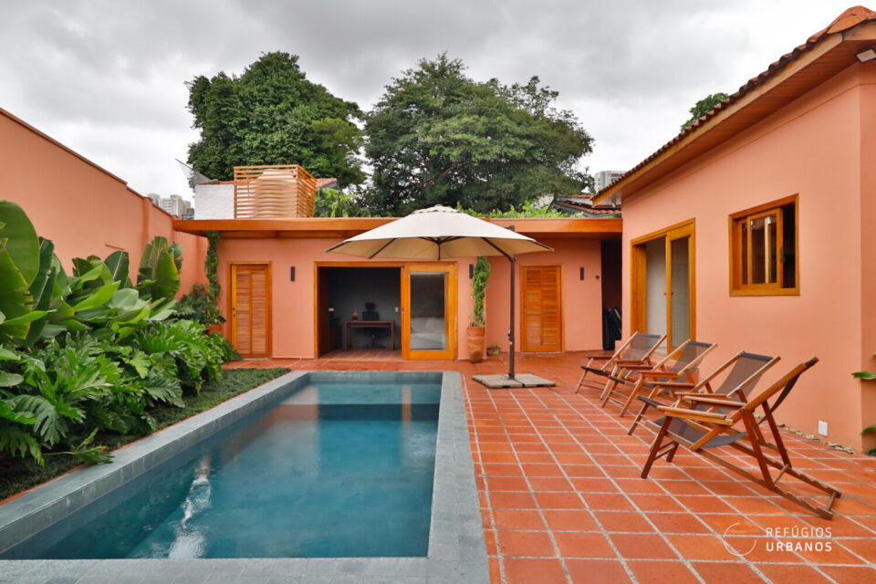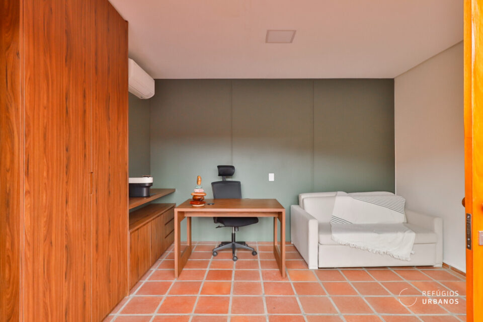 Do outro lado da piscina, uma edícula amplia as possibilidades de uso. Por trás de portas de correr em madeira e vidro, surge um espaço versátil, que funciona muito bem como escritório ou quarto de hóspedes. Ao lado, um banheiro completo se destaca pelo design sofisticado, com cuba esculpida no mesmo mármore da mesa externa, trazendo unidade e charme ao conjunto.