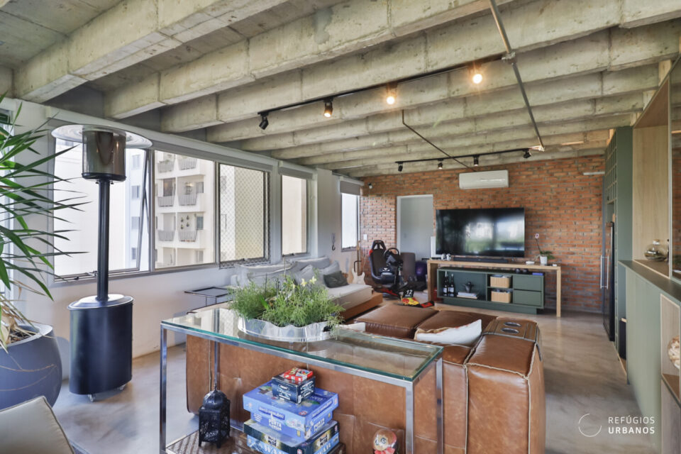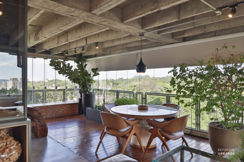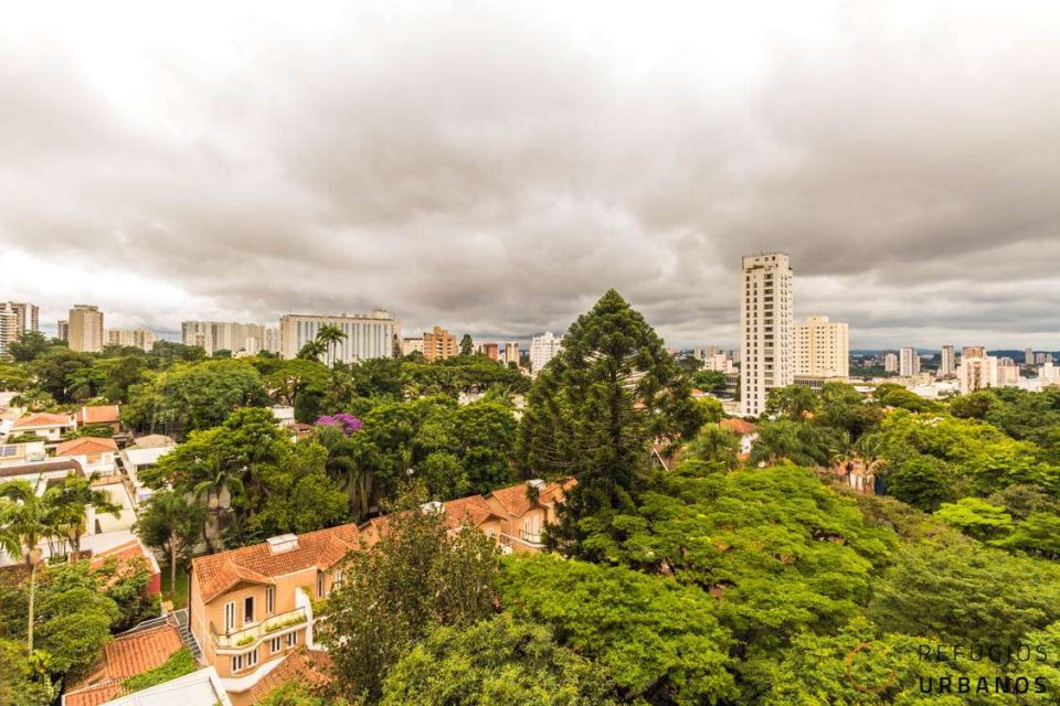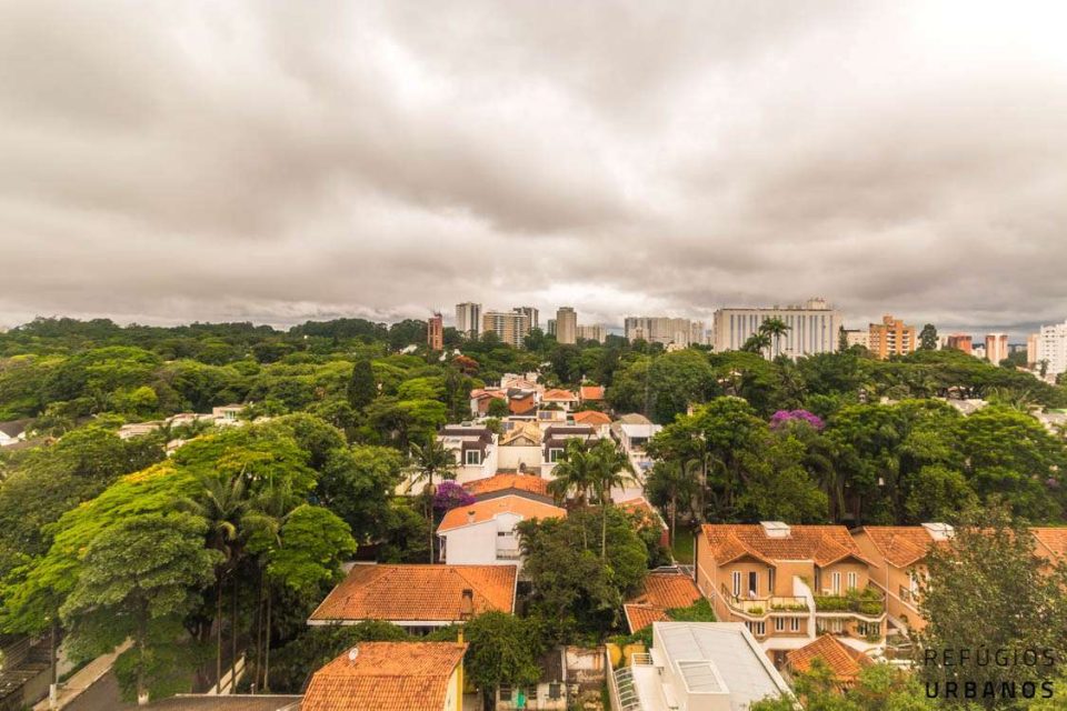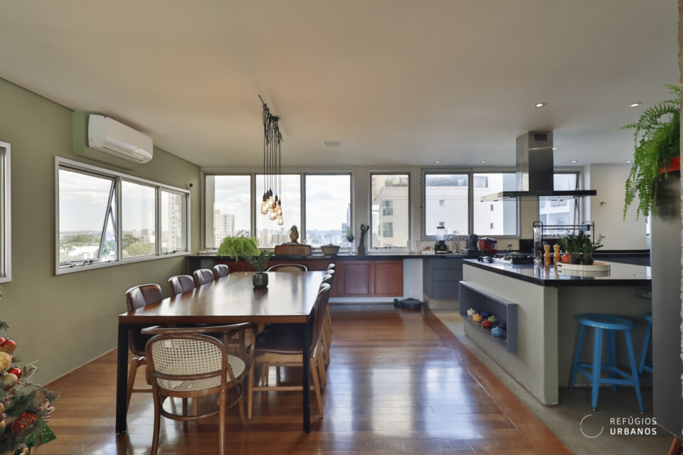 Estamos no Edifício Penthouse I, da Forma Espaço, um ícone do bairro, em um apartamento triplex reformado e com ambientes integrados, além de muita vista verde. Aqui, no Alto da Boa Vista, parece que o tempo desacelera.