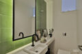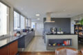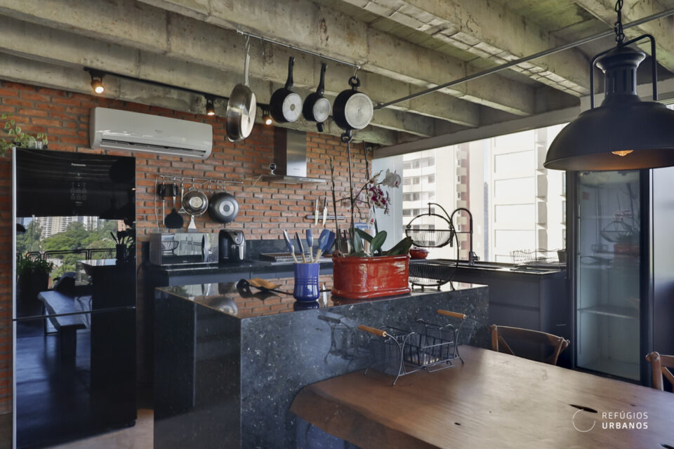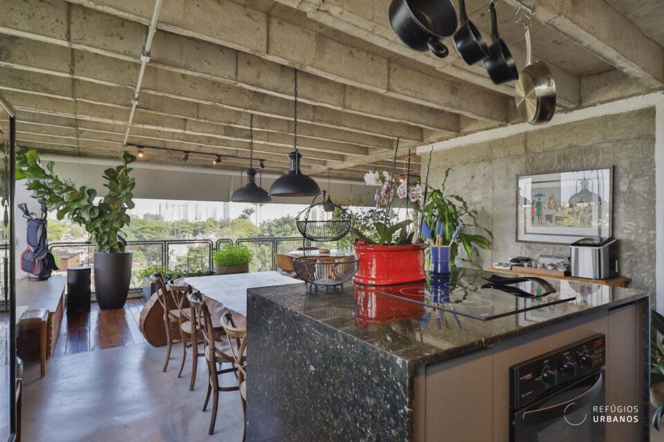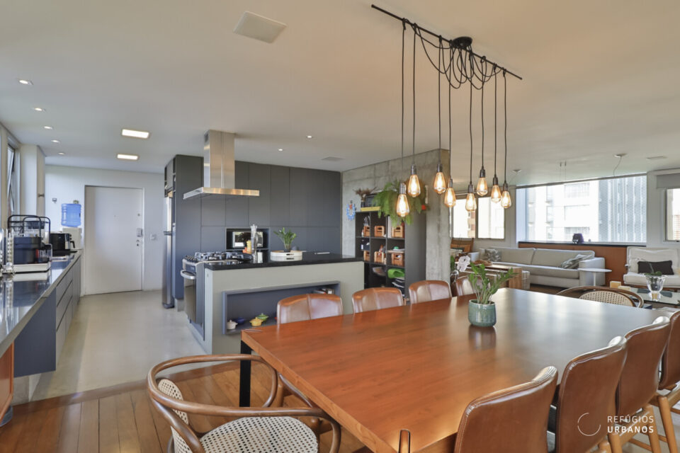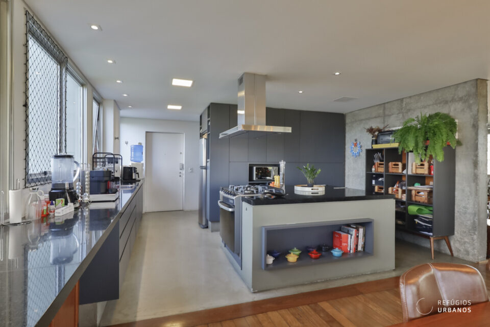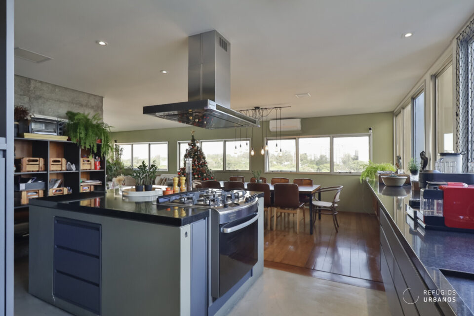 Temos uma sala de jantar integrada a esse ambiente e também à cozinha, por meio de uma ilha, em tons de cinza noite. O piso é de cimento queimado, e os eletrodomésticos estão todos embutidos. Além disso, adega e uma pia gigante de apoio, abaixo das enormes janelas, que trazem o verde como presente.