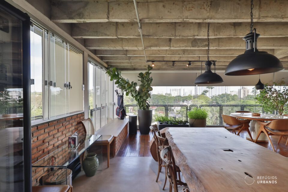 Uma mesa de madeira robusta dá mais charme e sofisticação ao ambiente, que também é presenteado pelos janelões e com a linda vista verde.