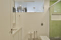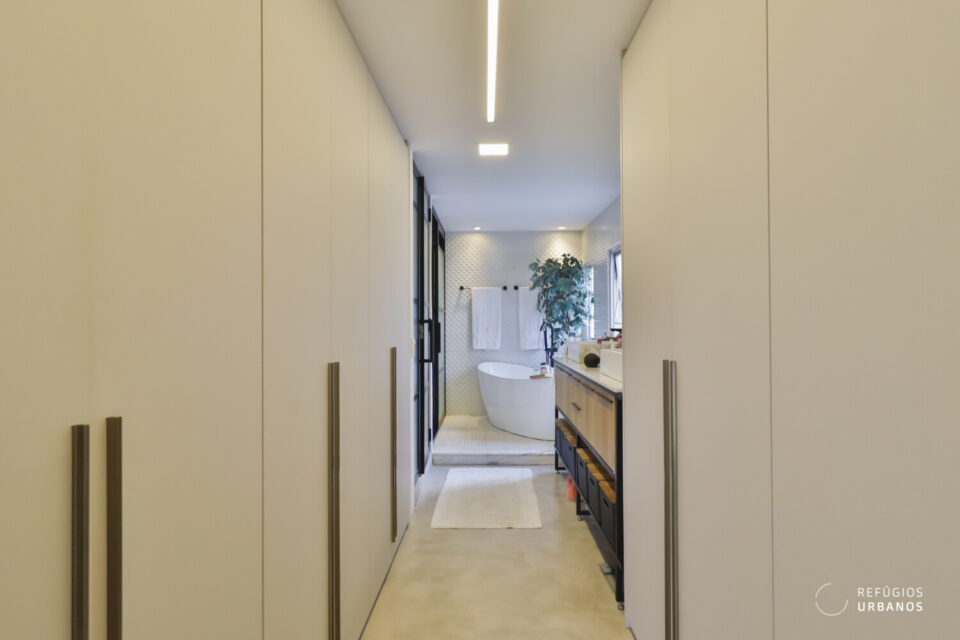 Outra escada nos leva ao andar intermediário: a área íntima, composta por três dormitórios, sendo duas suítes e mais um banheiro que dá apoio ao terceiro quarto.