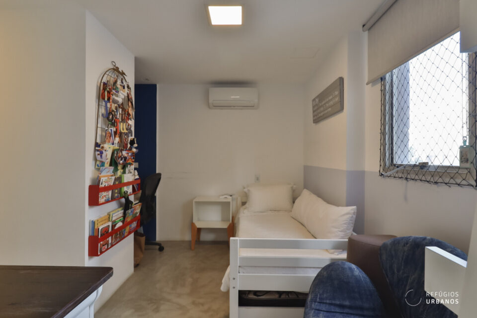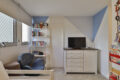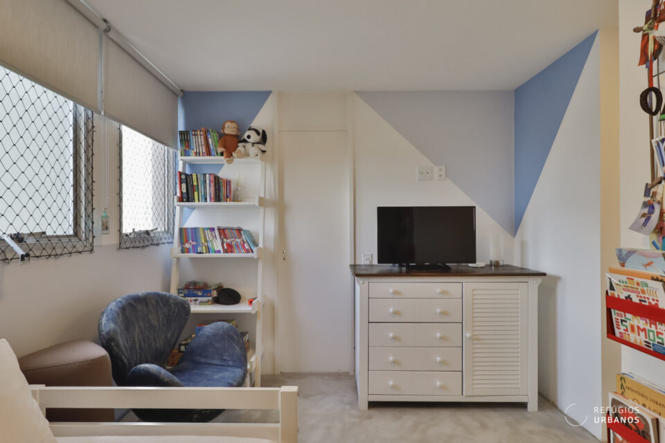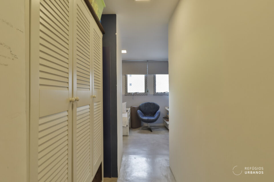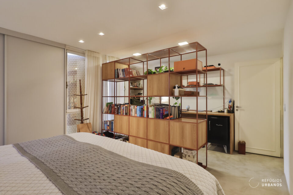 Na planta original, inicialmente, eram quatro dormitórios, ou seja, um deles deu mais espaço à suíte master, que hoje é bem ampla e tem um escritório bacana, com uma marcenaria estilosa e moderna.