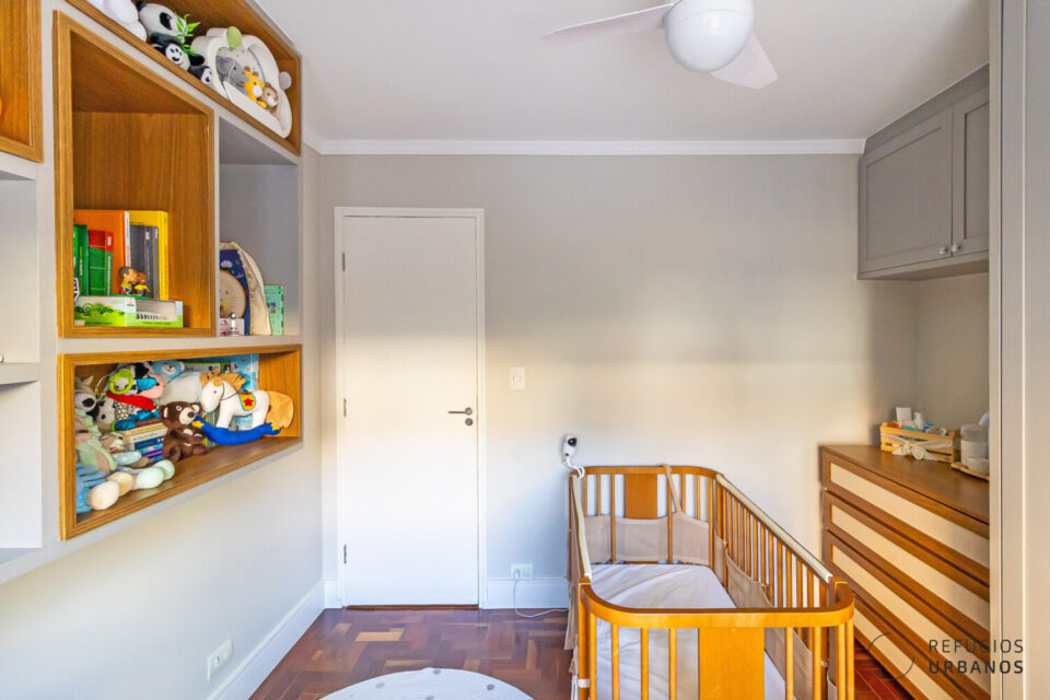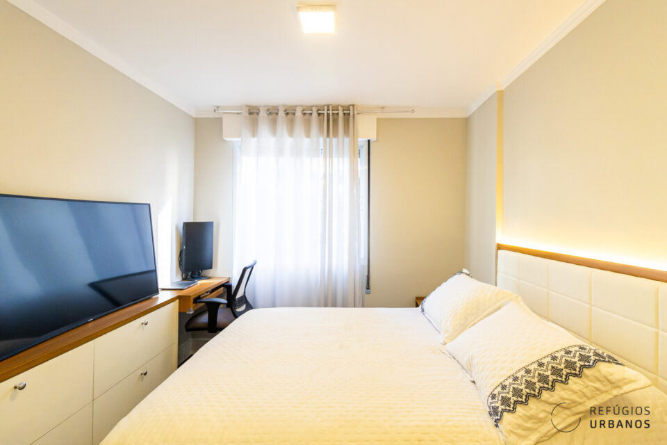 O primeiro dormitório conta com marcenaria de excelente qualidade e bem planejada que funciona como um coringa, tanto quanto um dormitório quando escritório e quarto de visitas.