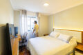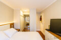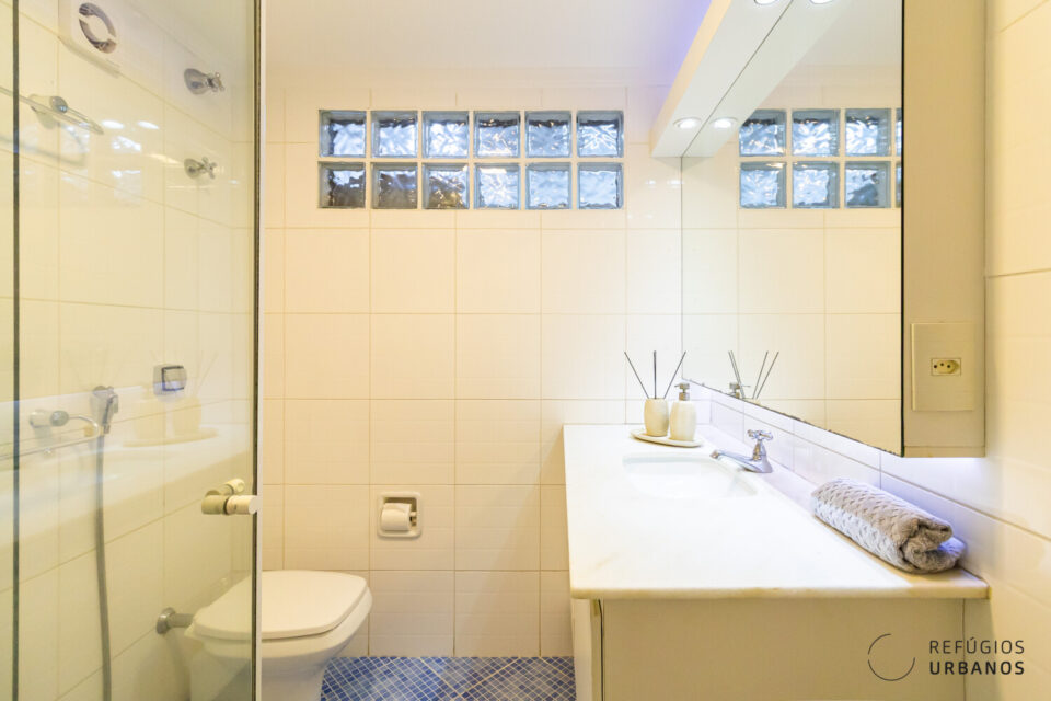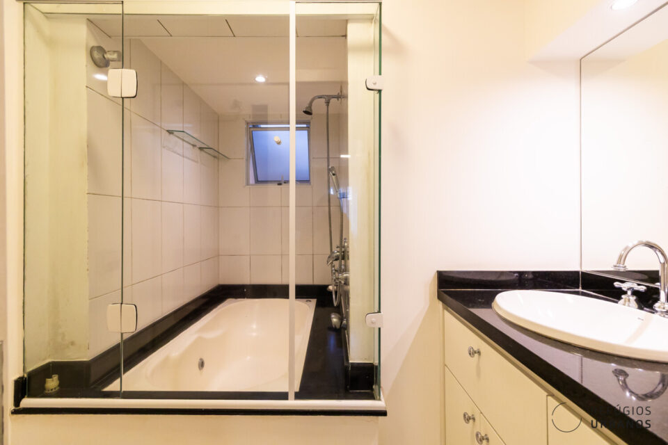 Já a suíte é ampla, ventilada, tem ar-condicionado, closet com bastante armários e um banheiro com banheira de hidromassagem e chuveiro a gás também, claro.