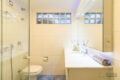 Um banheiro social com chuveiro a gás atende esse quarto.