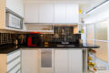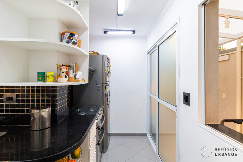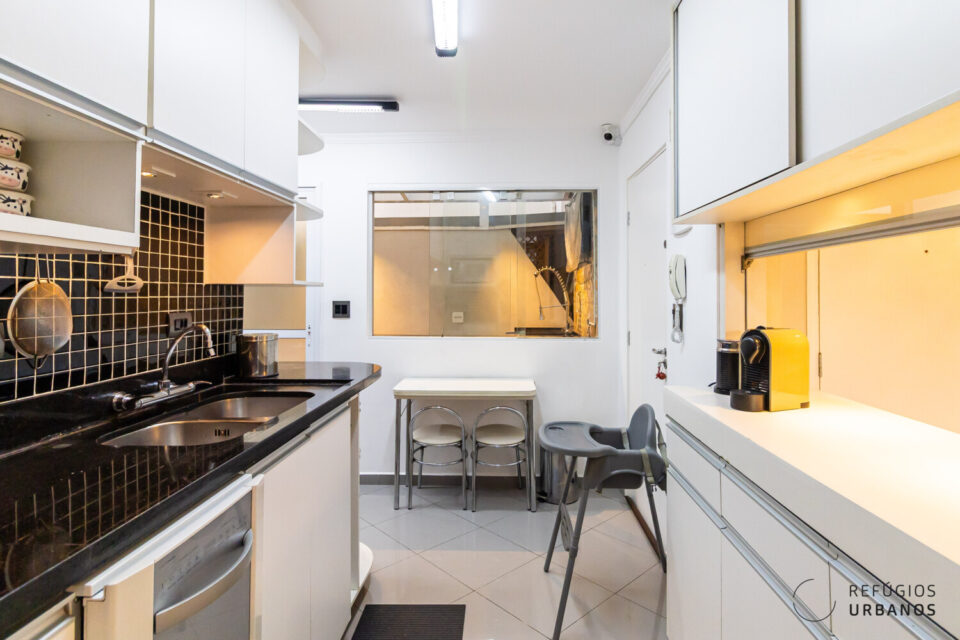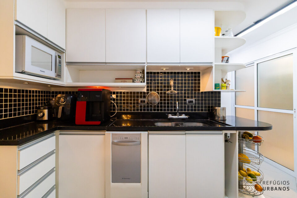 De volta à sala, a cozinha americana em L se integra ao living com bom espaço de bancada e armários planejados e ainda tem espaço para uma mesa para refeições rápidas.