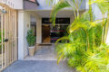 Logo na entrada, a sala de estar e jantar se abrem de forma generosa. A janela funciona como um quadro vivo de palmeira verde e garante uma vista tranquila e acolhedora, como se estivéssemos em uma casa.