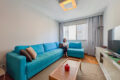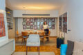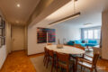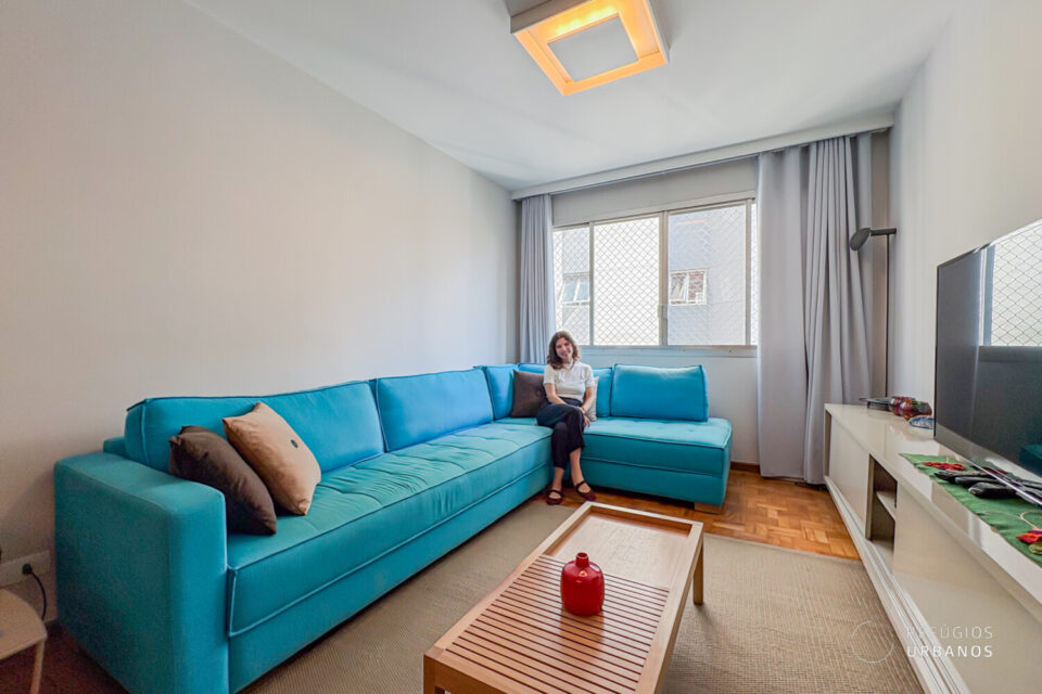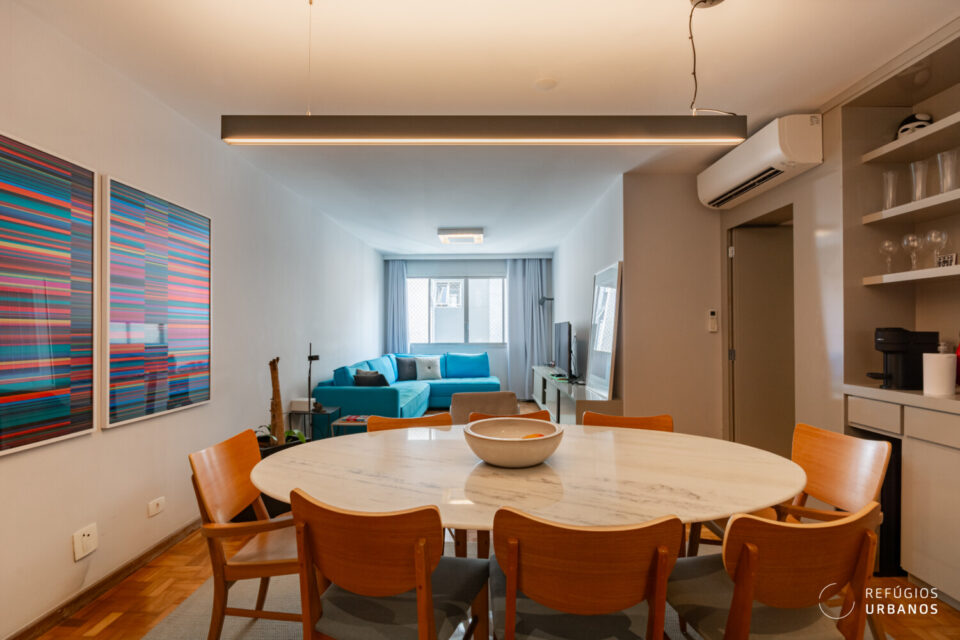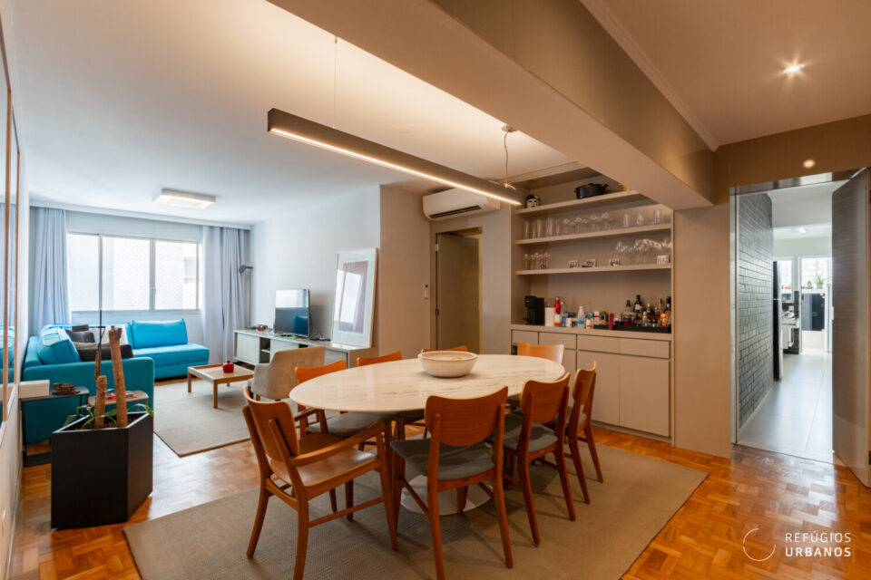 Ampla e integrada com a sala de jantar, ela comporta uma mesa confortável de 8 lugares. E aqui, então, entra a escolha do freguês: dependendo do seu costume, você pode optar por uma mesa menor, porém é bom saber que tem espaço para mais. Além disso, a reforma foi esperta e aproveitou o canto para um belo armário que funciona como cristaleira. Já o living é muito confortável. Sofá em L, poltronas, um hack. Funciona, mais uma vez, como uma tela em branco para você adaptar ao seu jeito de viver.