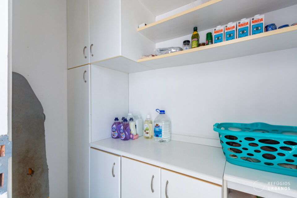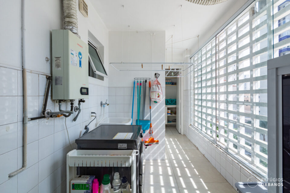 Com marcenaria refeita na reforma de 2018, tudo é muito funcional. No entanto, o que realmente chama atenção é a lavanderia: elementos vazados, muita claridade e ventilação generosa. Além disso, a obra aproveitou o antigo quarto de serviço. Dividido ao meio, ele virou uma despensa que atende a lavanderia e a cozinha, e o closet da suíte master. Um raciocínio de espaço, difícil de encontrar.