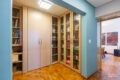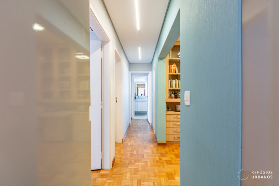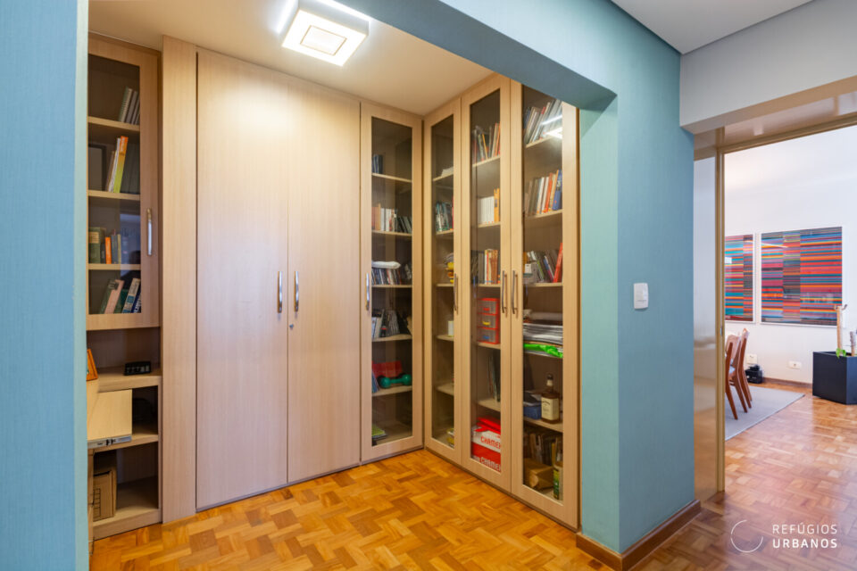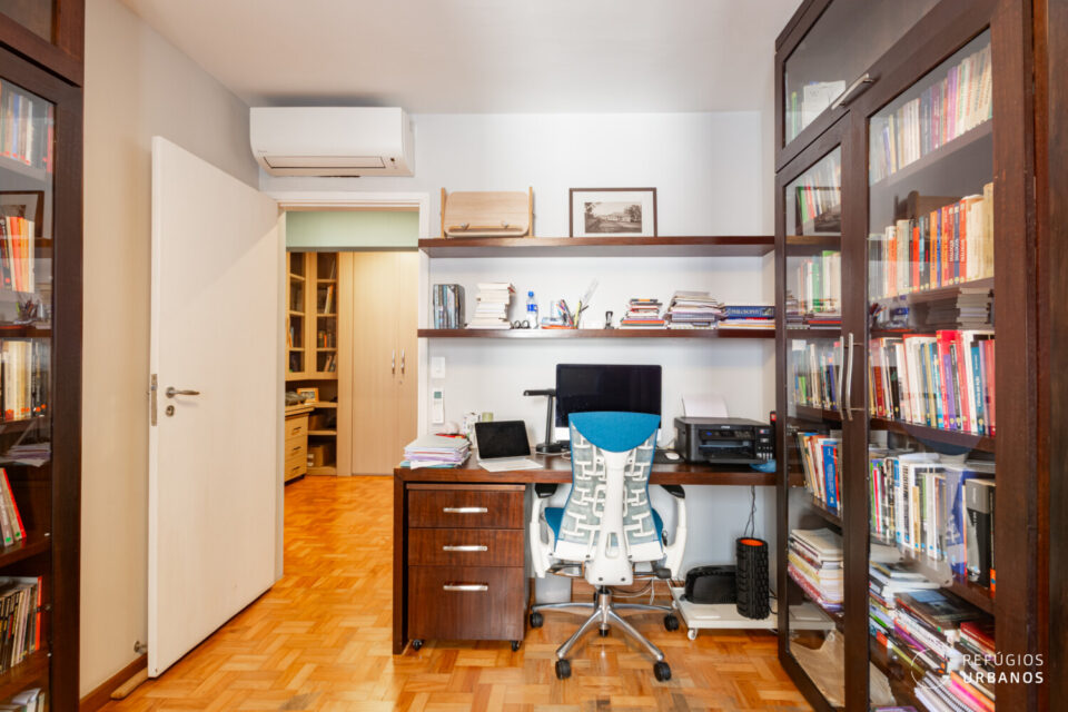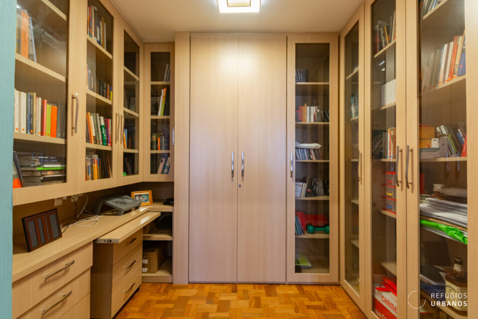 E já aqui se percebe a inteligência desta obra. O que era antigamente a copa se abriu para o corredor e, assim, virou uma biblioteca com espaço para escritório. Ou seja, se você precisa de 3 quartos e de um cantinho para trabalhar, este apartamento entrega os dois sem concessões.