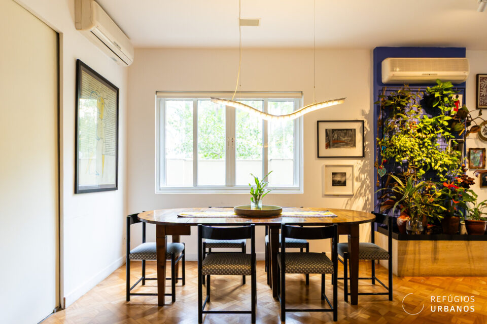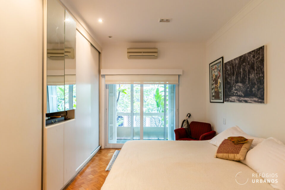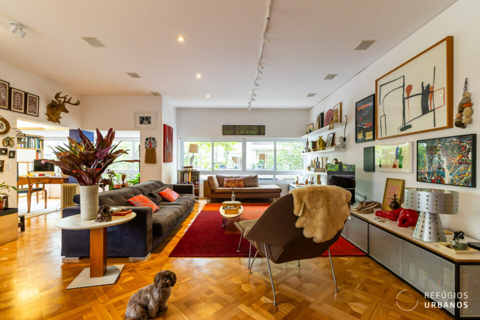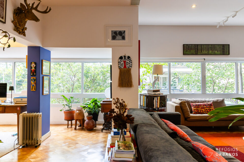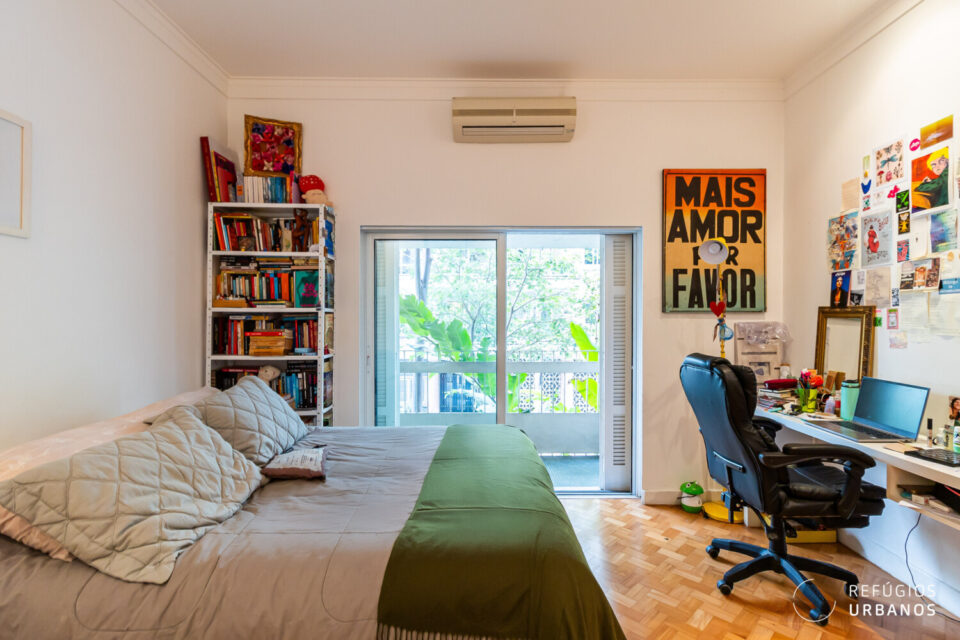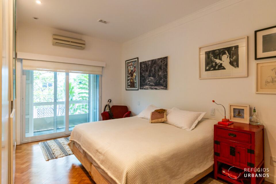 O pé-direito alto e o piso de taco reforçam a sensação de amplitude, enquanto as varandas nos dormitórios, com portas-balcão, oferecem aconchego e privacidade.