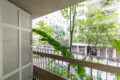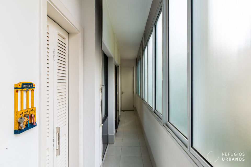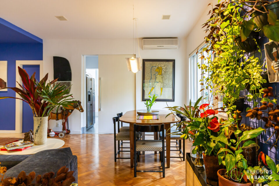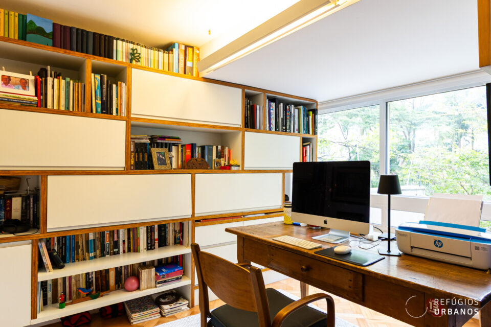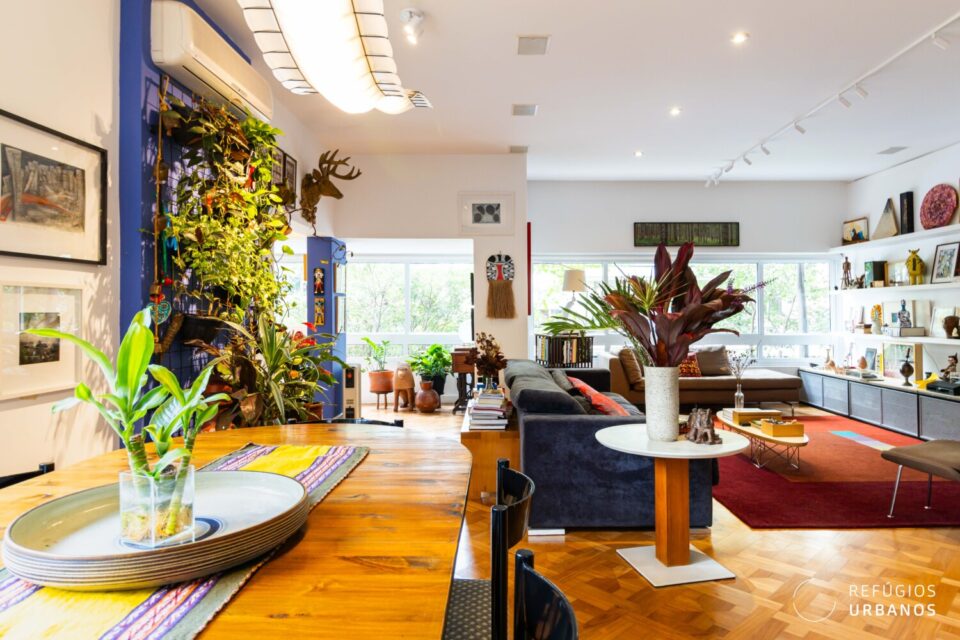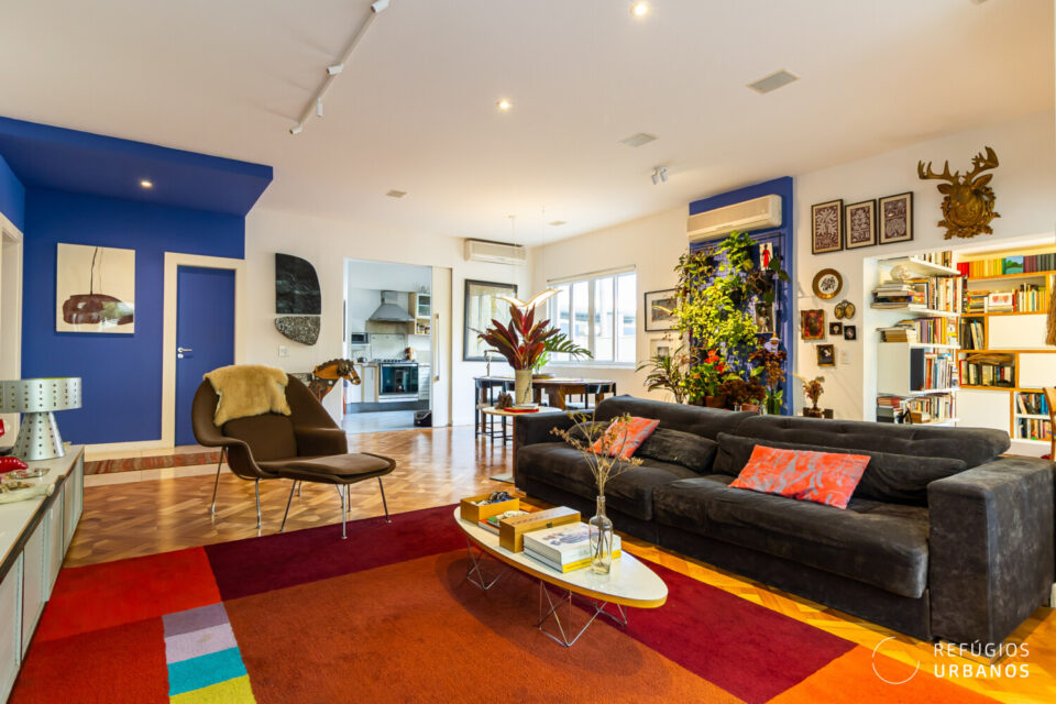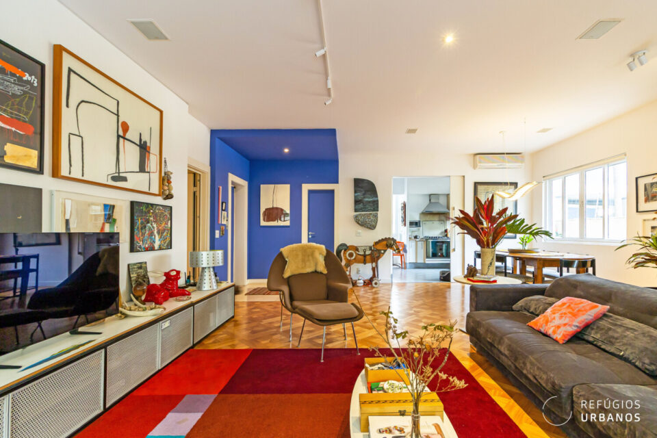 O pé-direito alto e o piso de taco reforçam a sensação de amplitude, enquanto as varandas nos dormitórios, com portas-balcão, oferecem aconchego e privacidade.