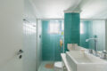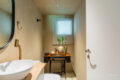 O lavabo atende a área social com discrição. Em seguida, o corredor leva à parte íntima: três quartos confortáveis, todos com armários sob medida.