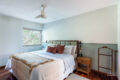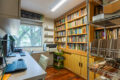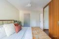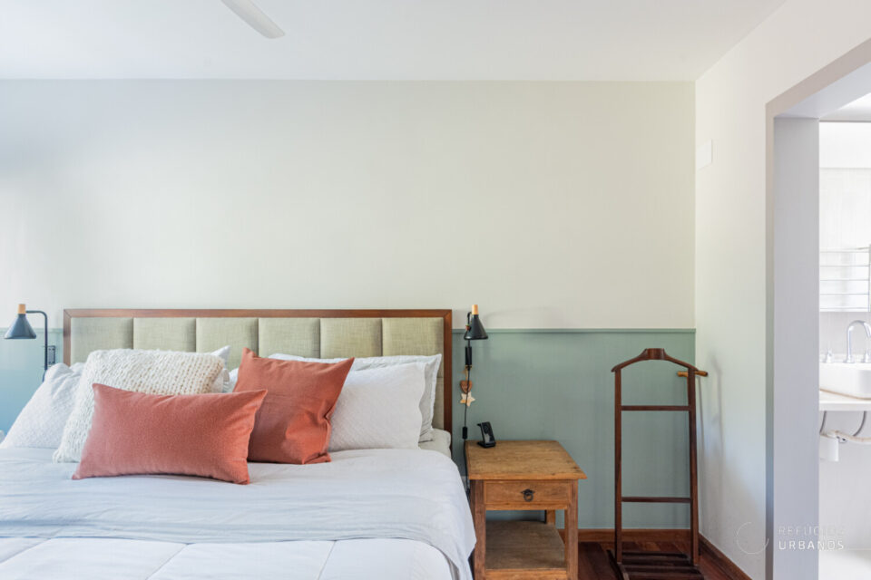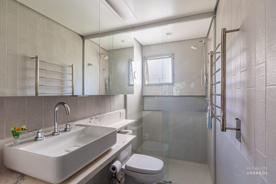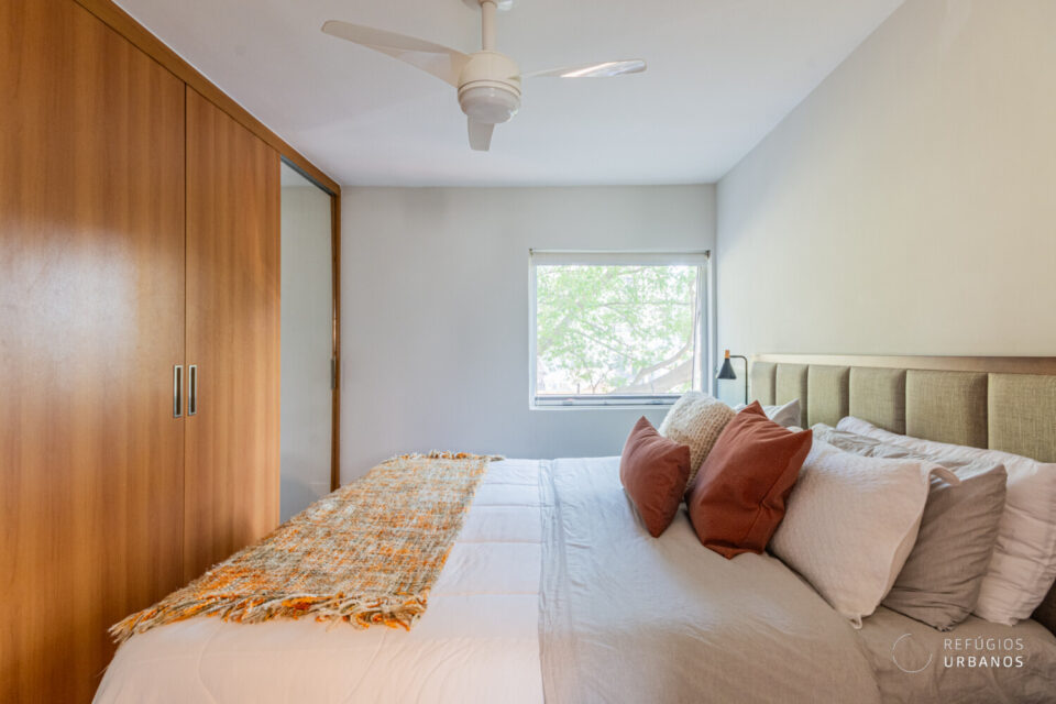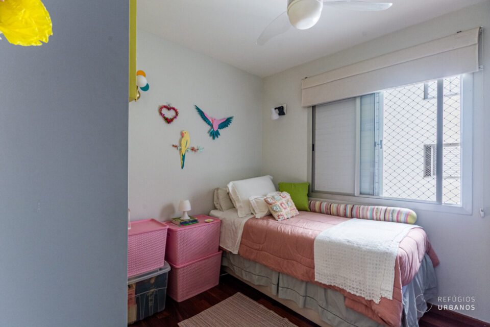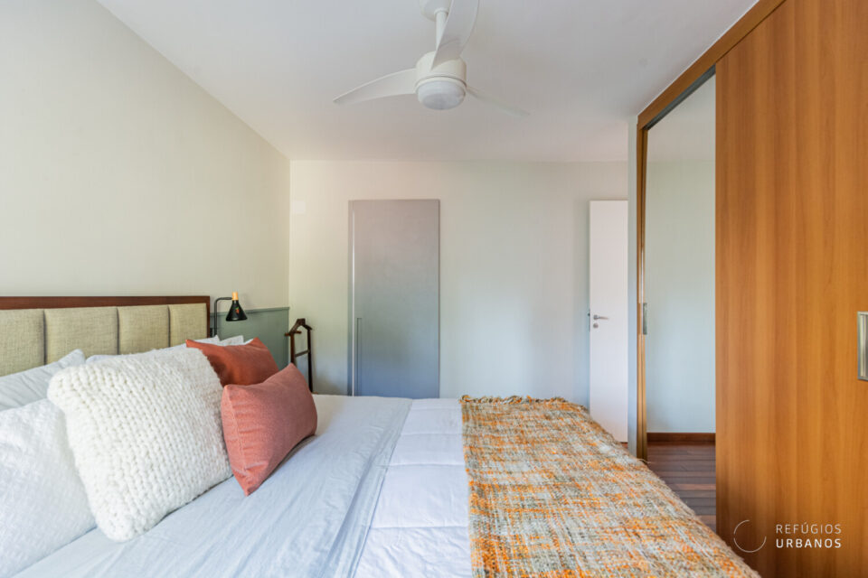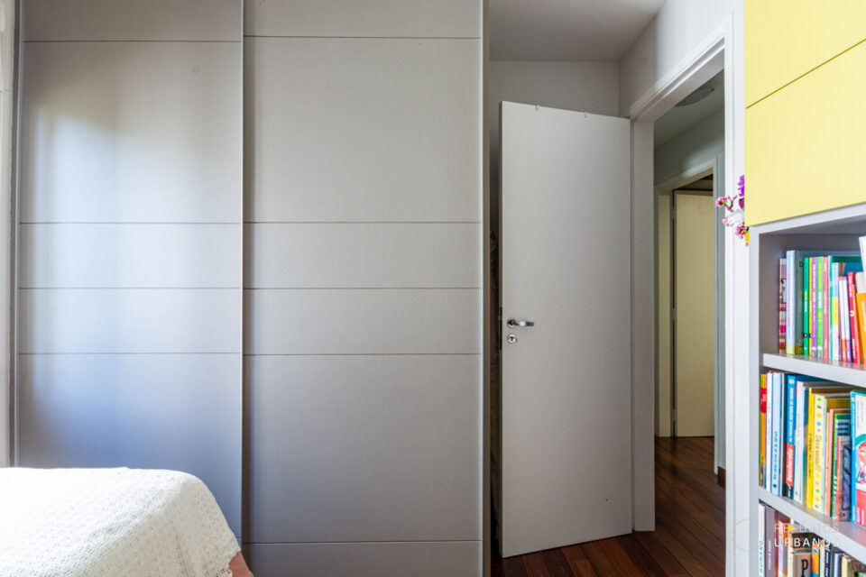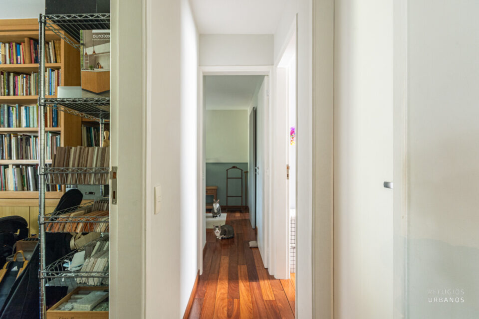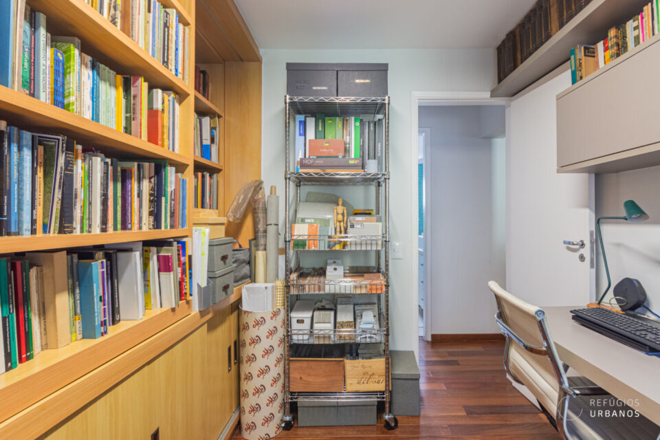 A suíte é generosa e silenciosa. Já o primeiro quarto foi transformado em escritório com biblioteca dupla — um refúgio para quem trabalha ou estuda em casa.