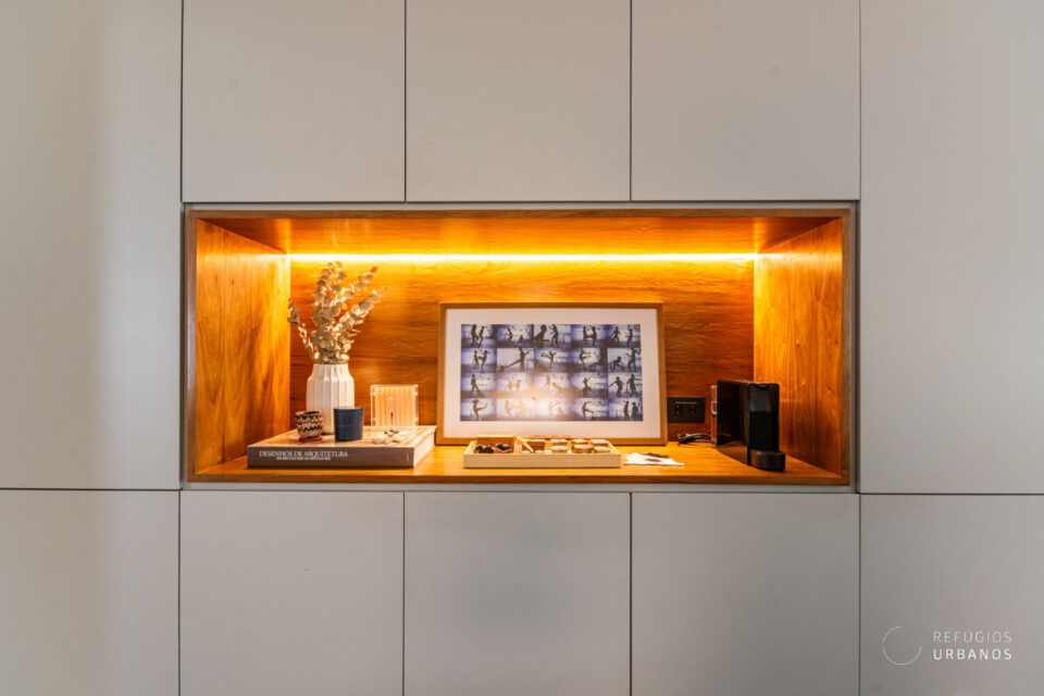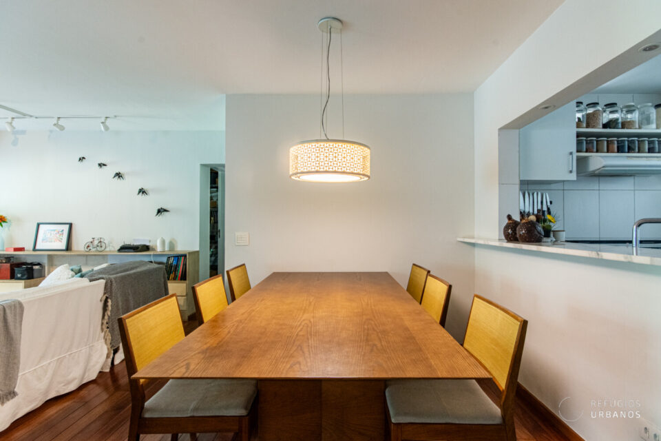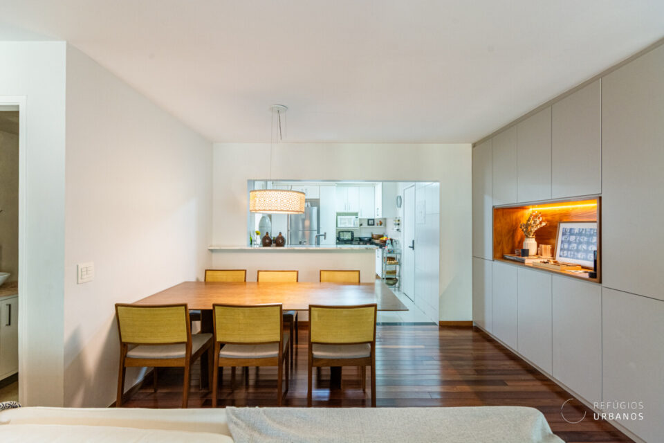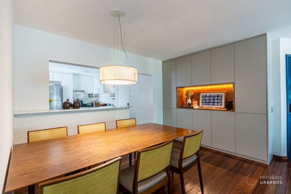 A planta foi cuidadosamente repensada, e portanto, os espaços agora fluem com naturalidade. A cozinha foi aberta e ampliada, tendo sido unida com o antigo quarto de apoio. Dessa forma, o ambiente se tornou mais integrado e funcional. A marcenaria branca aparece em vários pontos, otimizando o espaço sem perder leveza.
