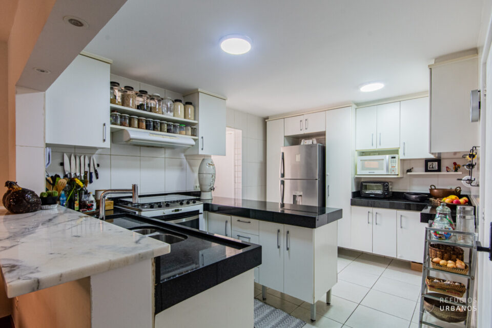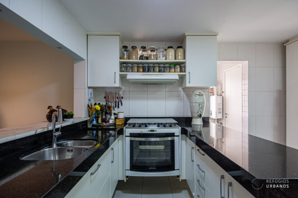 A cozinha, clara e ventilada, tem passagem direta para a lavanderia. Por isso, o dia a dia aqui é prático.
