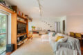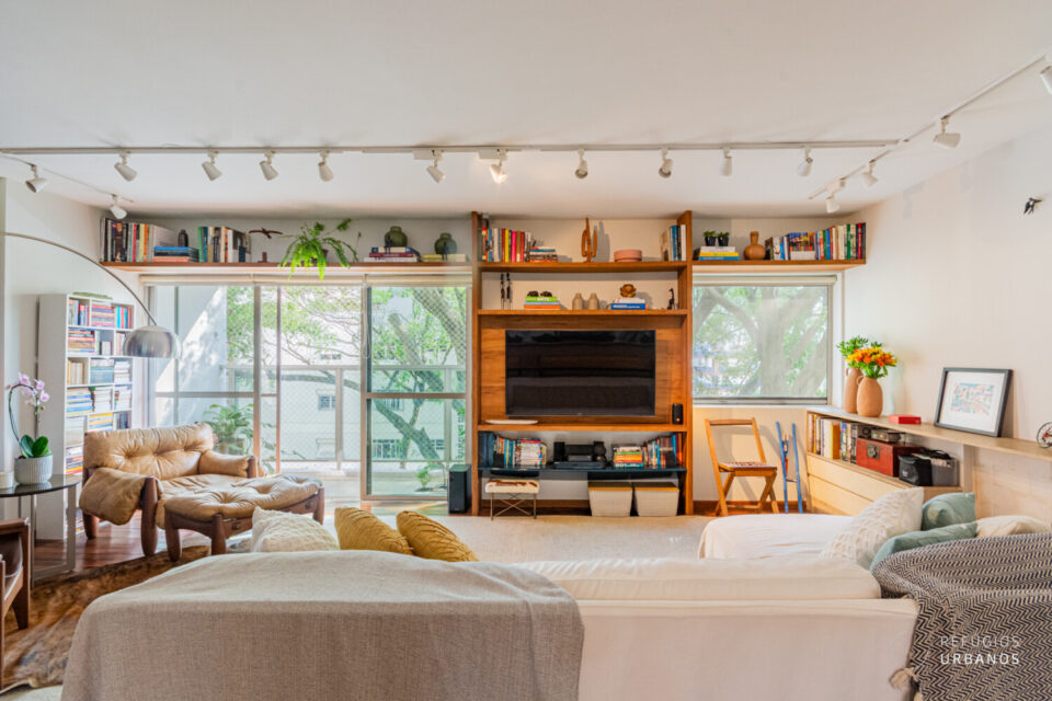 Sala iluminada, marcenaria sob medida e piso contínuo