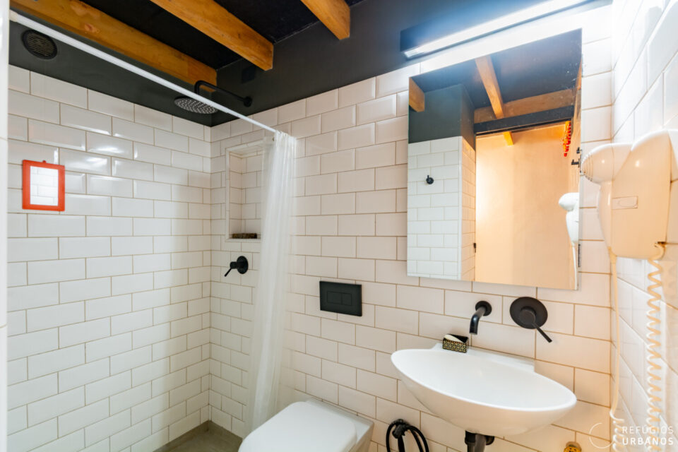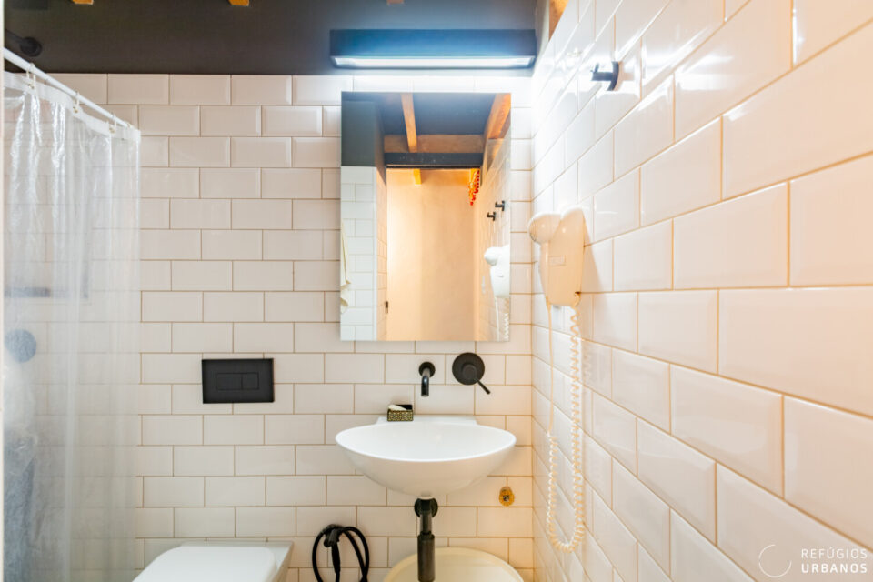 Além disso, o ambiente conta com exaustor conectado ao shaft do prédio, o que assegura melhor ventilação. A parede que separa o banheiro da sala utiliza blocos de concreto aparente.