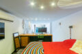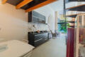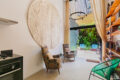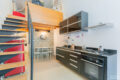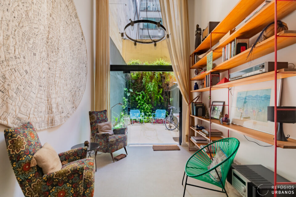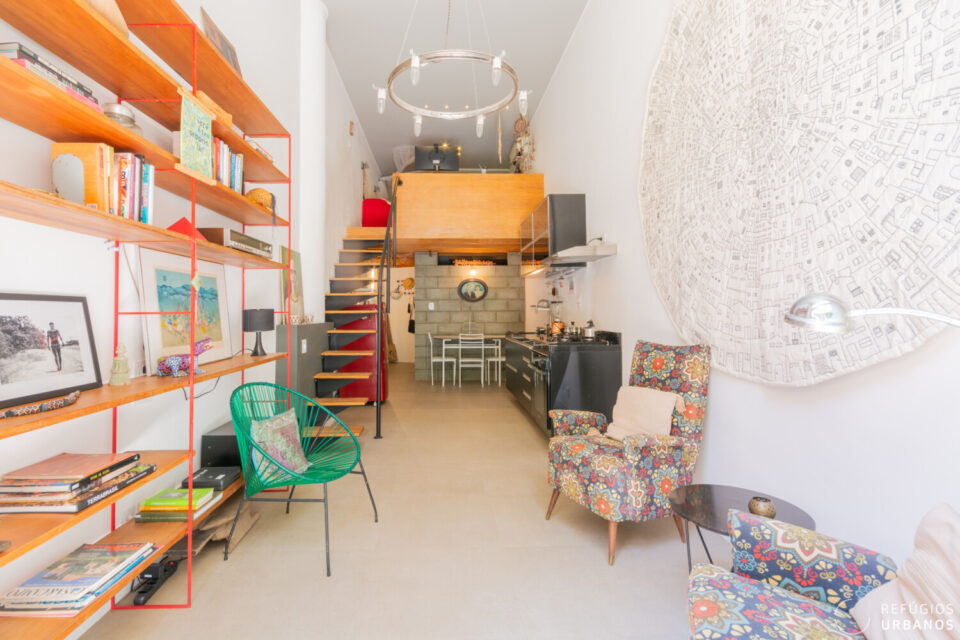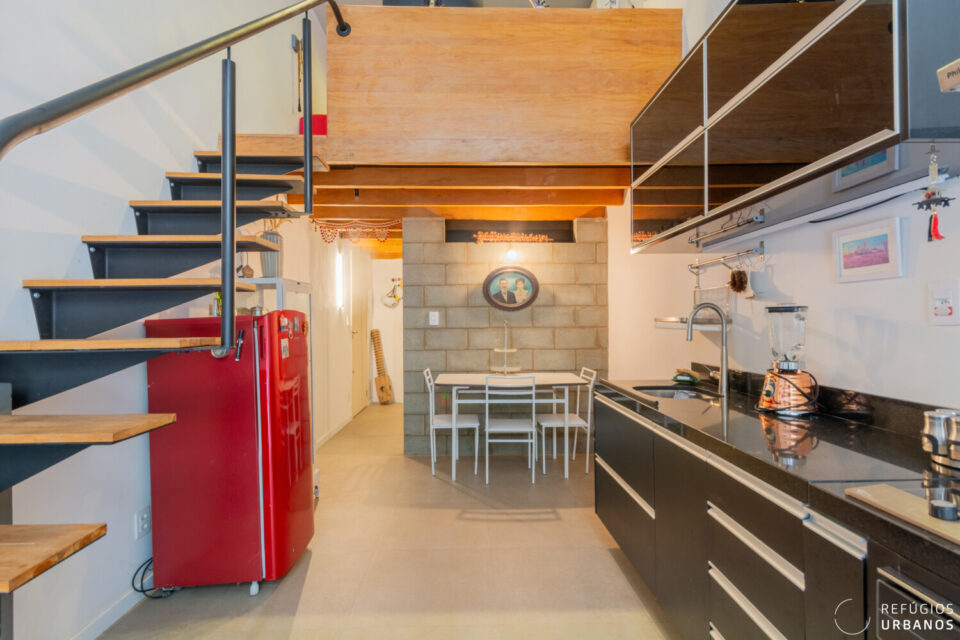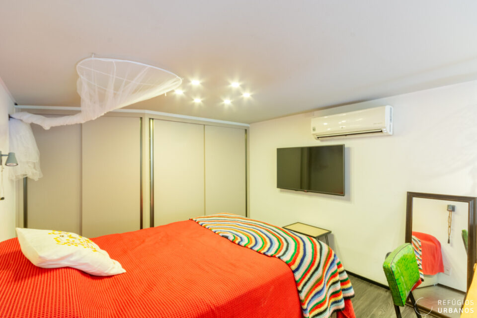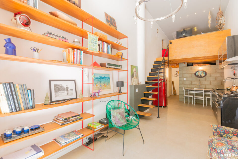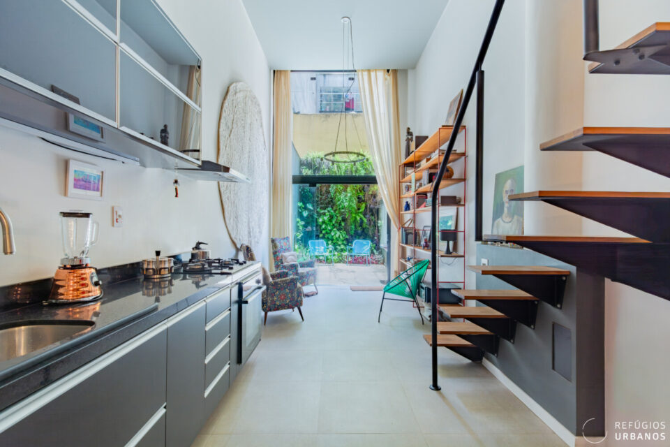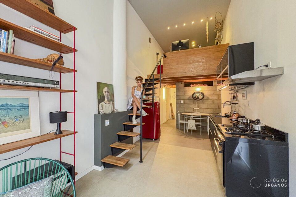 O mezanino que abriga o dormitório utiliza madeira de demolição em peroba-rosa. Além disso, o espaço conta com armários planejados. O garden possui ar-condicionado, capaz de climatizar todo o imóvel e tornar o apartamento confortável em todas as estações.