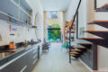 Por fim, a escada, com degraus flutuantes apoiados em parede concretada, reforça o cuidado técnico e o desenho preciso adotados na reforma.