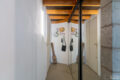 Já na entrada, um armário sob medida e com portas espelhadas, garante privacidade para a sala ao abrir a porta. Ao mesmo tempo, o móvel abriga a lava e seca embutida, prateleiras funcionais e o acesso ao banheiro.