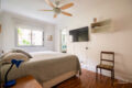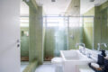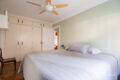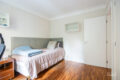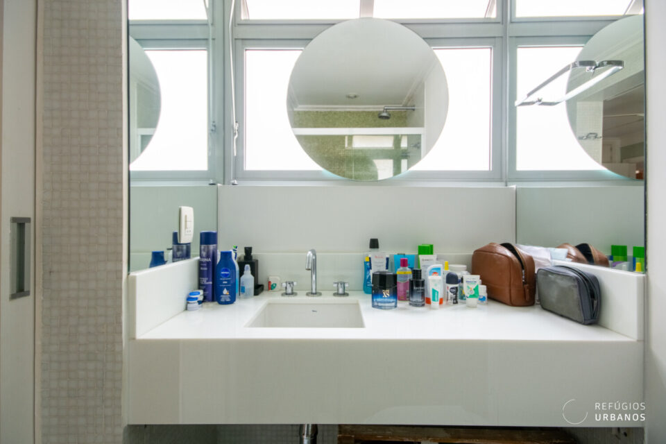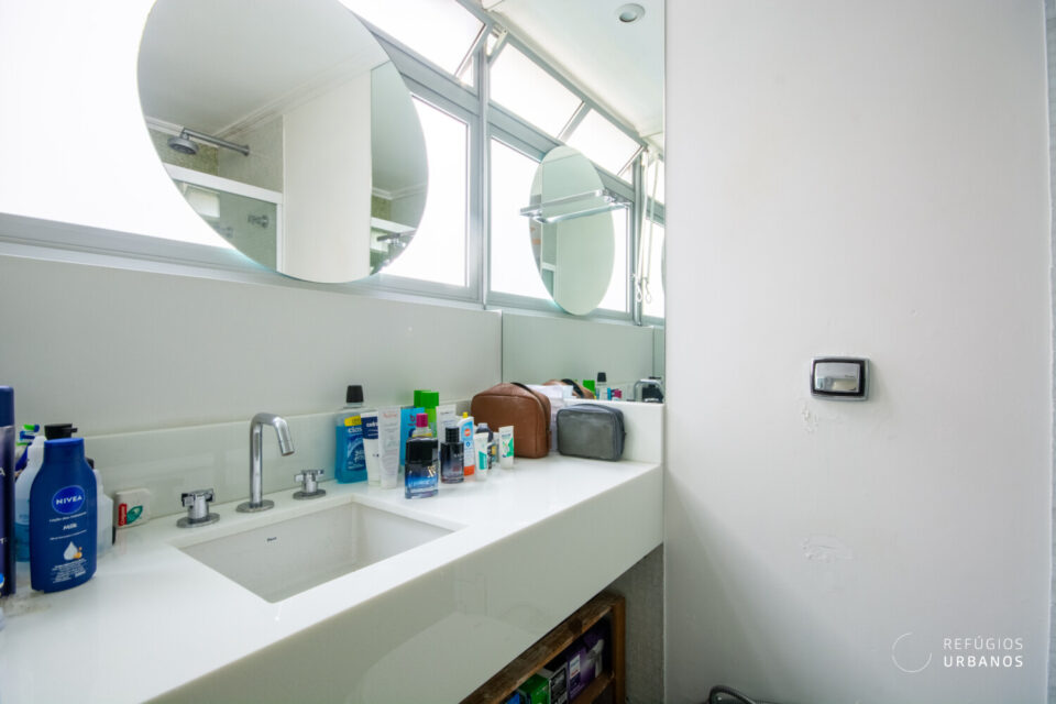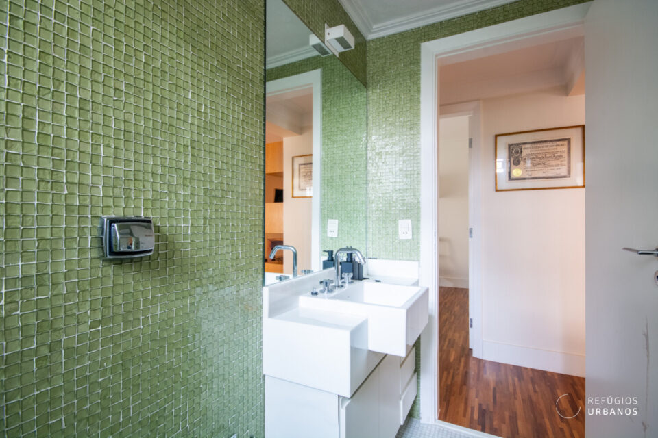 Um segundo banheiro social completo atende o segundo quarto e faz as vezes do lavabo, sendo igualmente equipado com marcenaria.