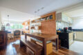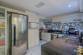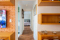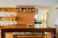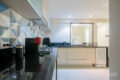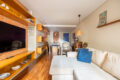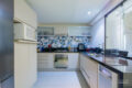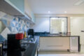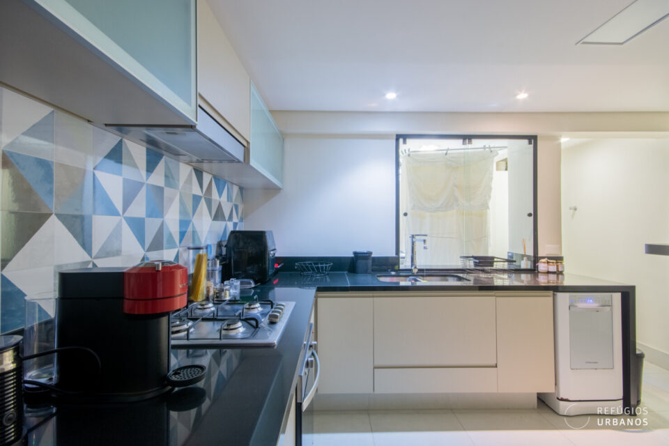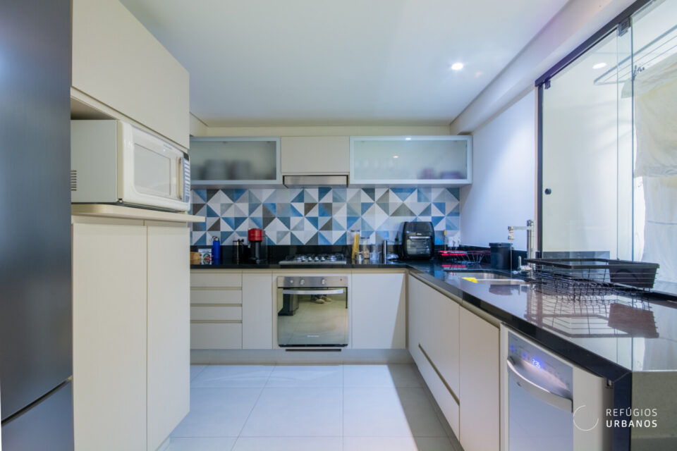 A cozinha, que foi integrada à sala, está equipada com marcenaria planejada e eletrodomésticos embutidos; tudo pensado para a praticidade e funcionalidade do dia a dia.