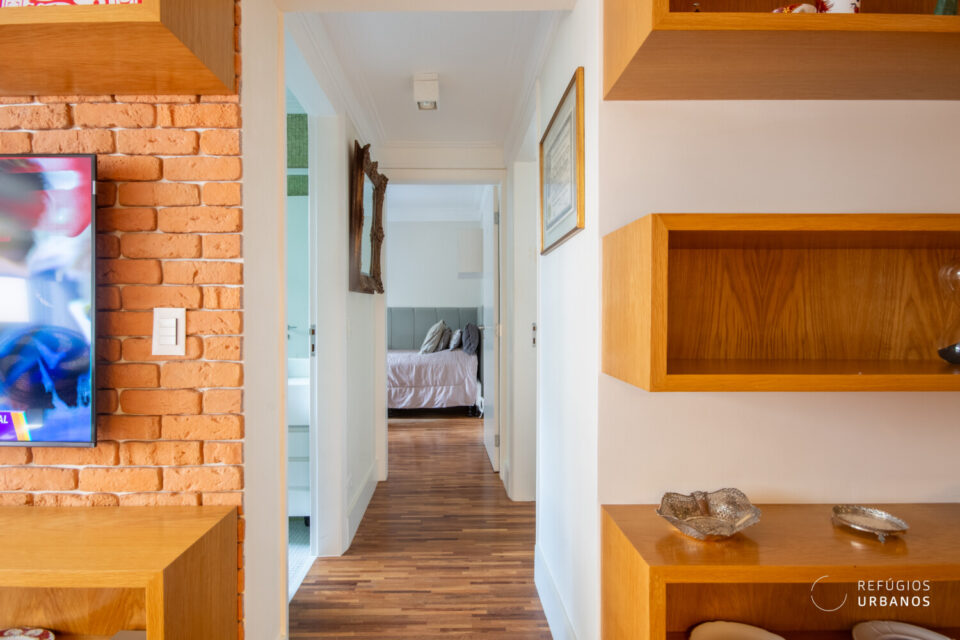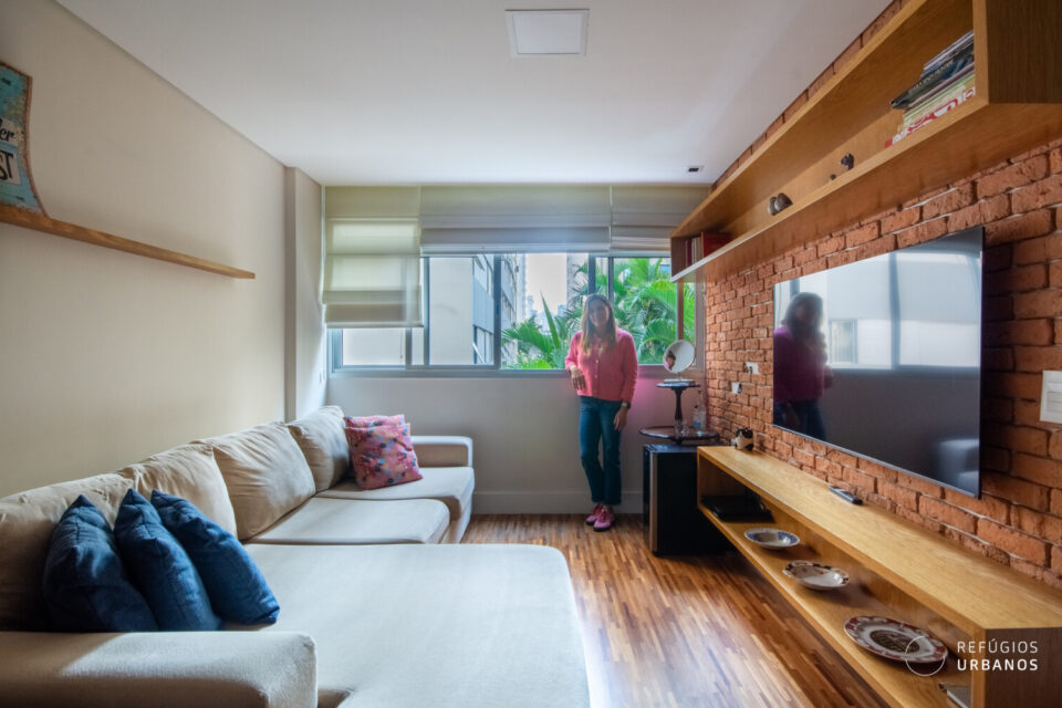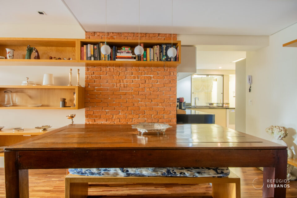 Entrando, temos um amplo living com grandes janelas e espaço para dois ambientes confortáveis. Uma parede de tijolinho traz muito aconchego ao ambiente.