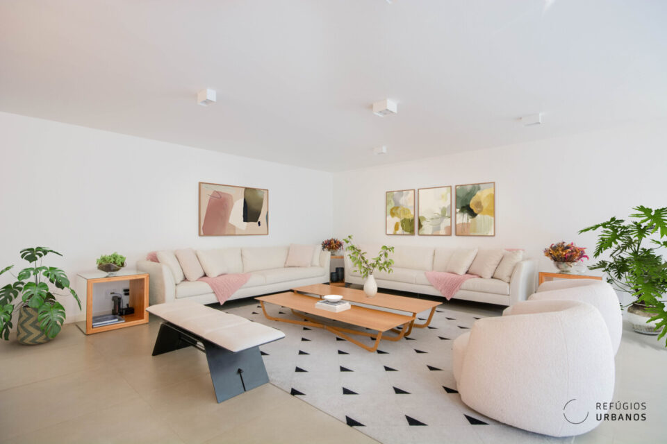 Por fim, o prédio tem bom recuo em relação à rua. A copa de uma árvore preenche a vista da sala, trazendo privacidade e leveza. Uma localização tranquila e, ao mesmo tempo, bem conectada com a cidade.